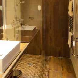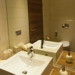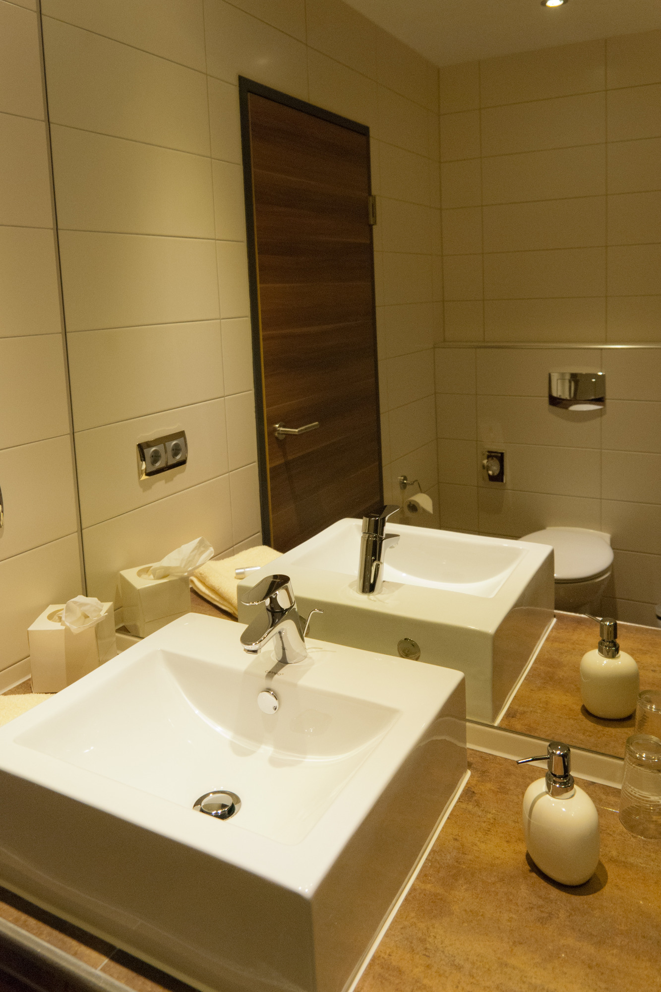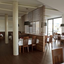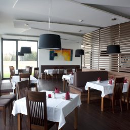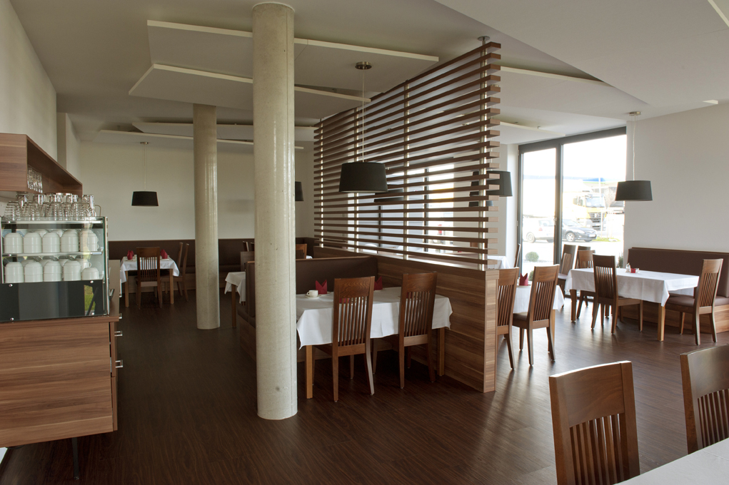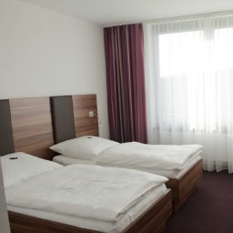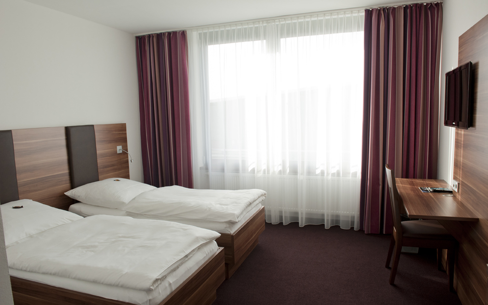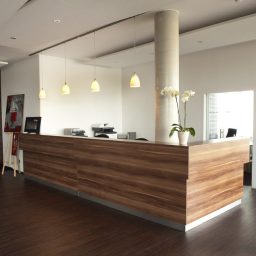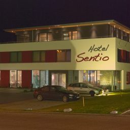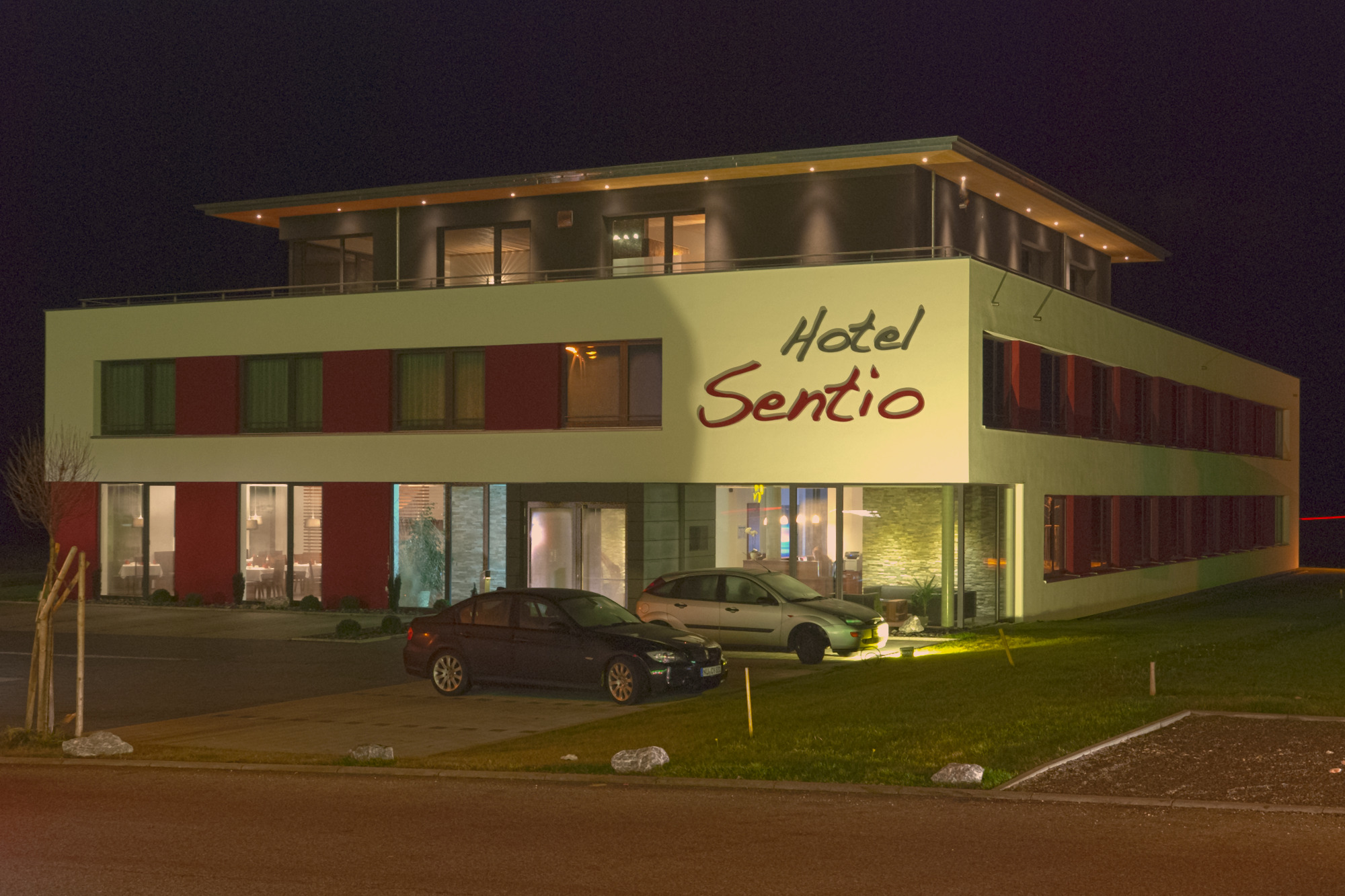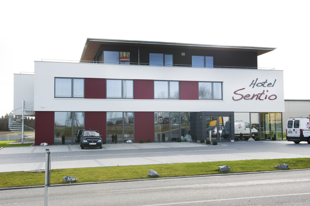 Moderne Hotelfassade mit roten und weißen Elementen und Parkplatz davor.