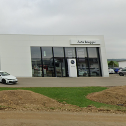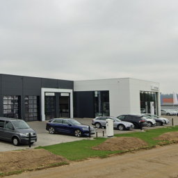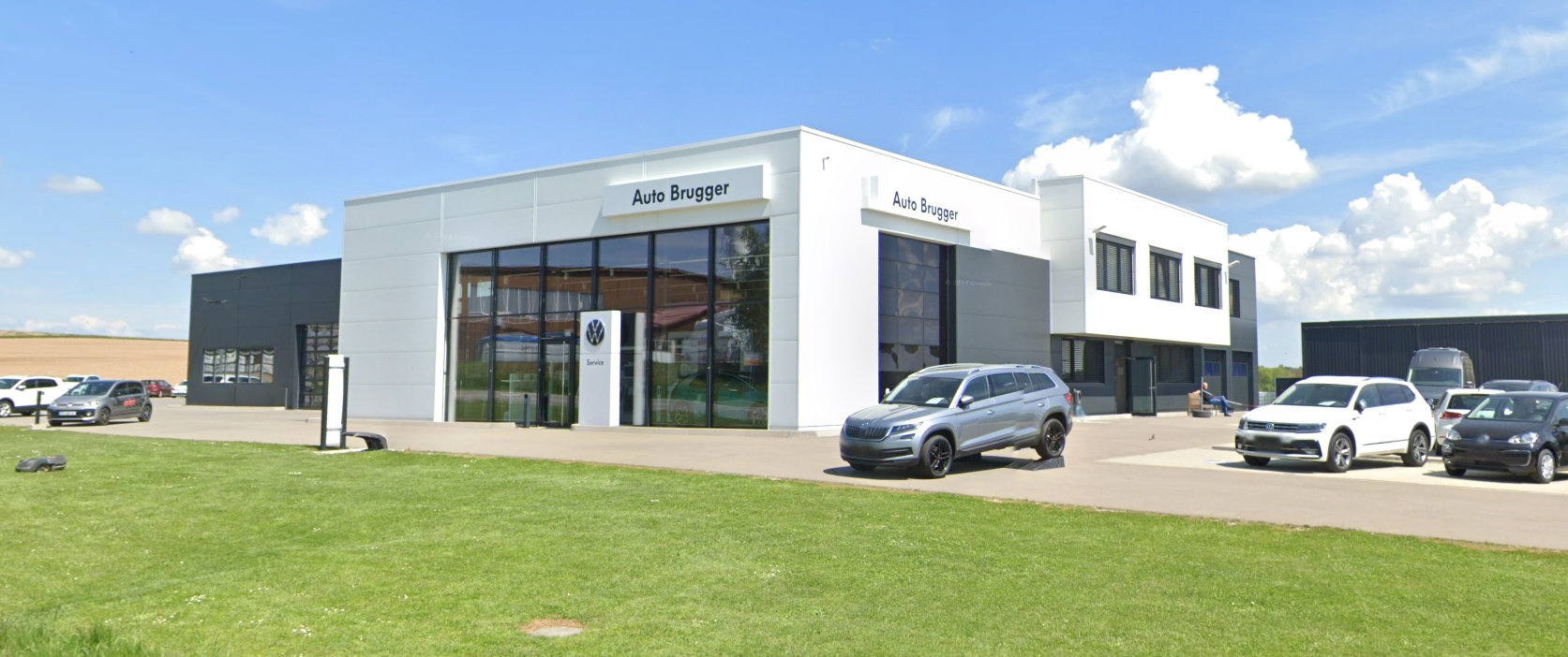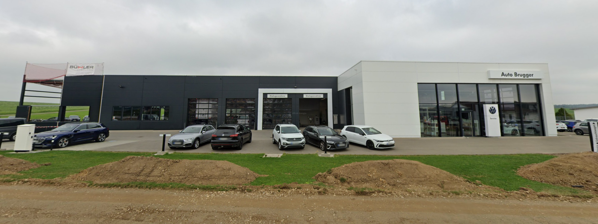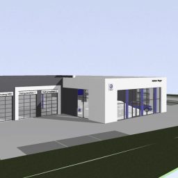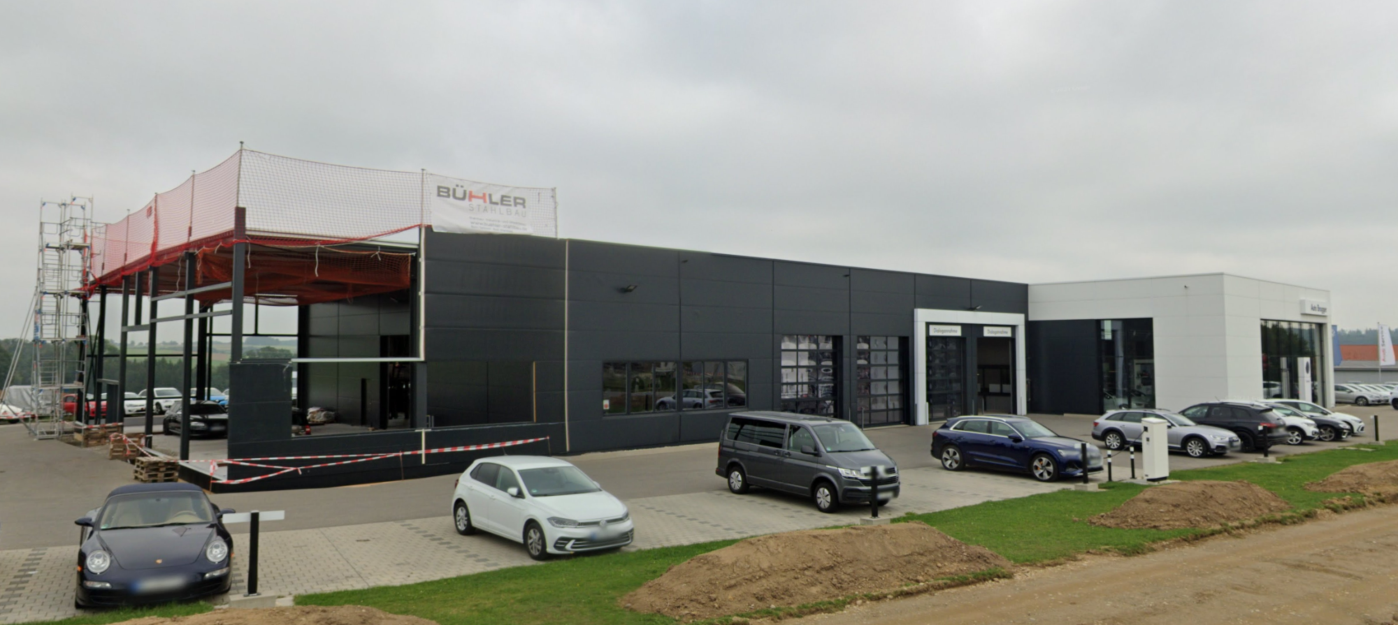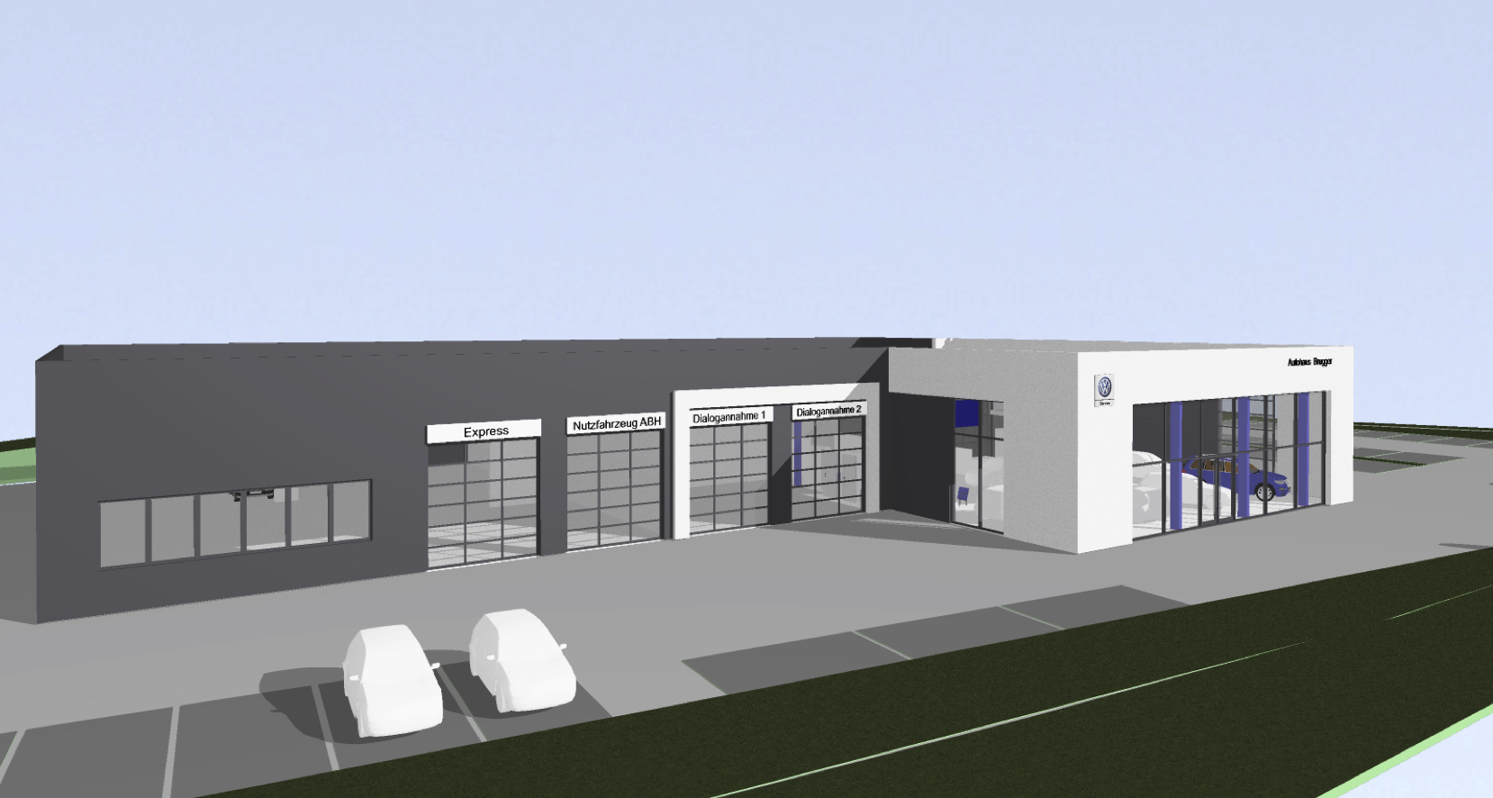 Moderne Autowerkstatt mit Glasfront und zwei Fahrzeugen vor einem geschlossenen Parkplatz.