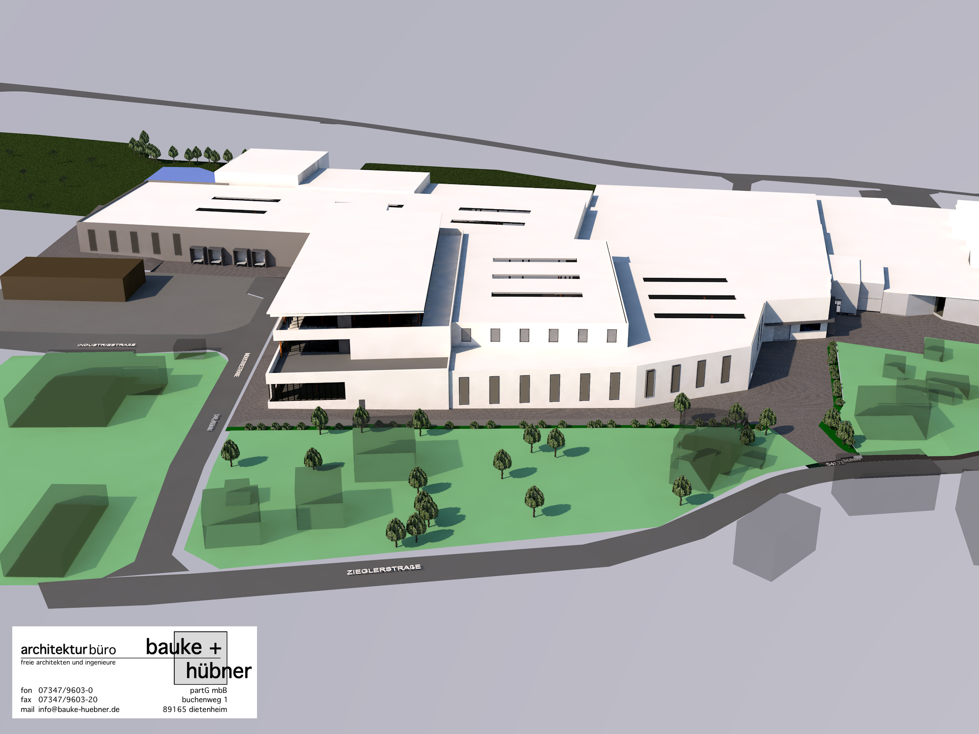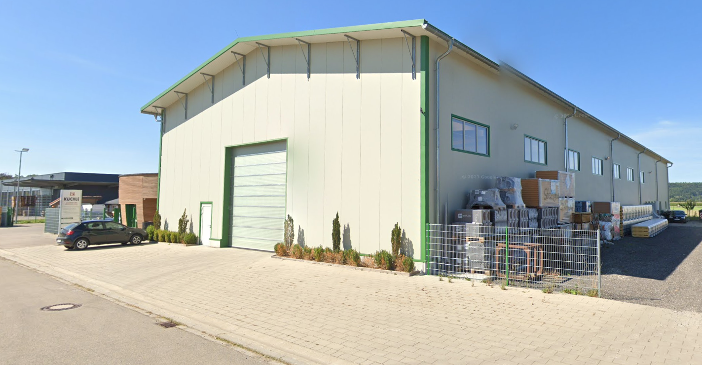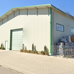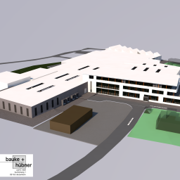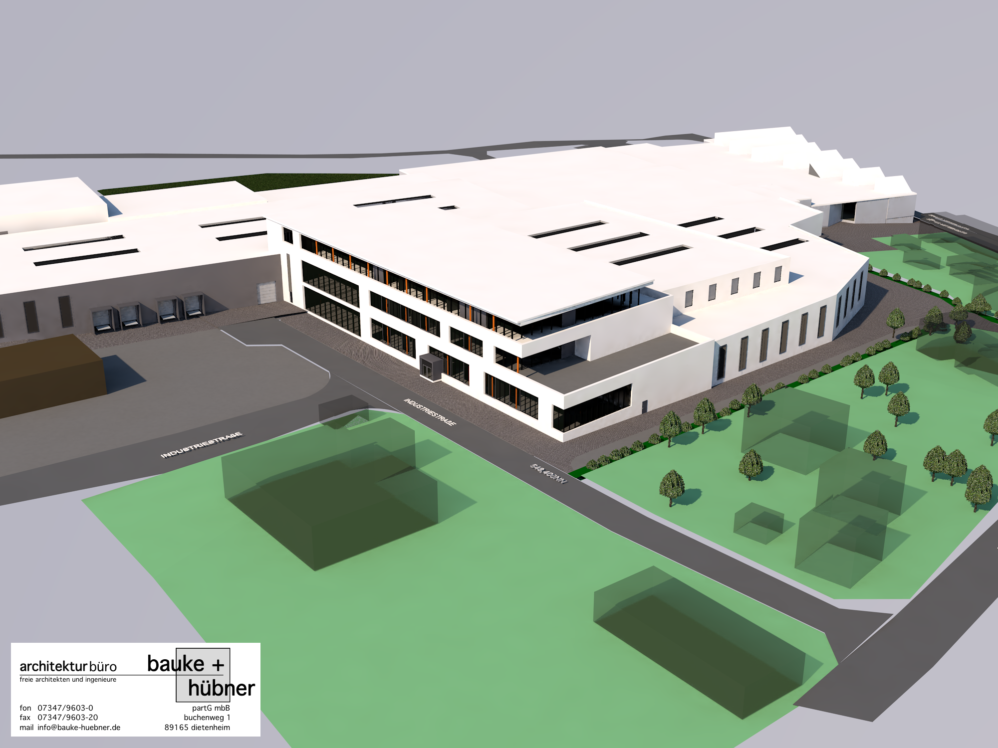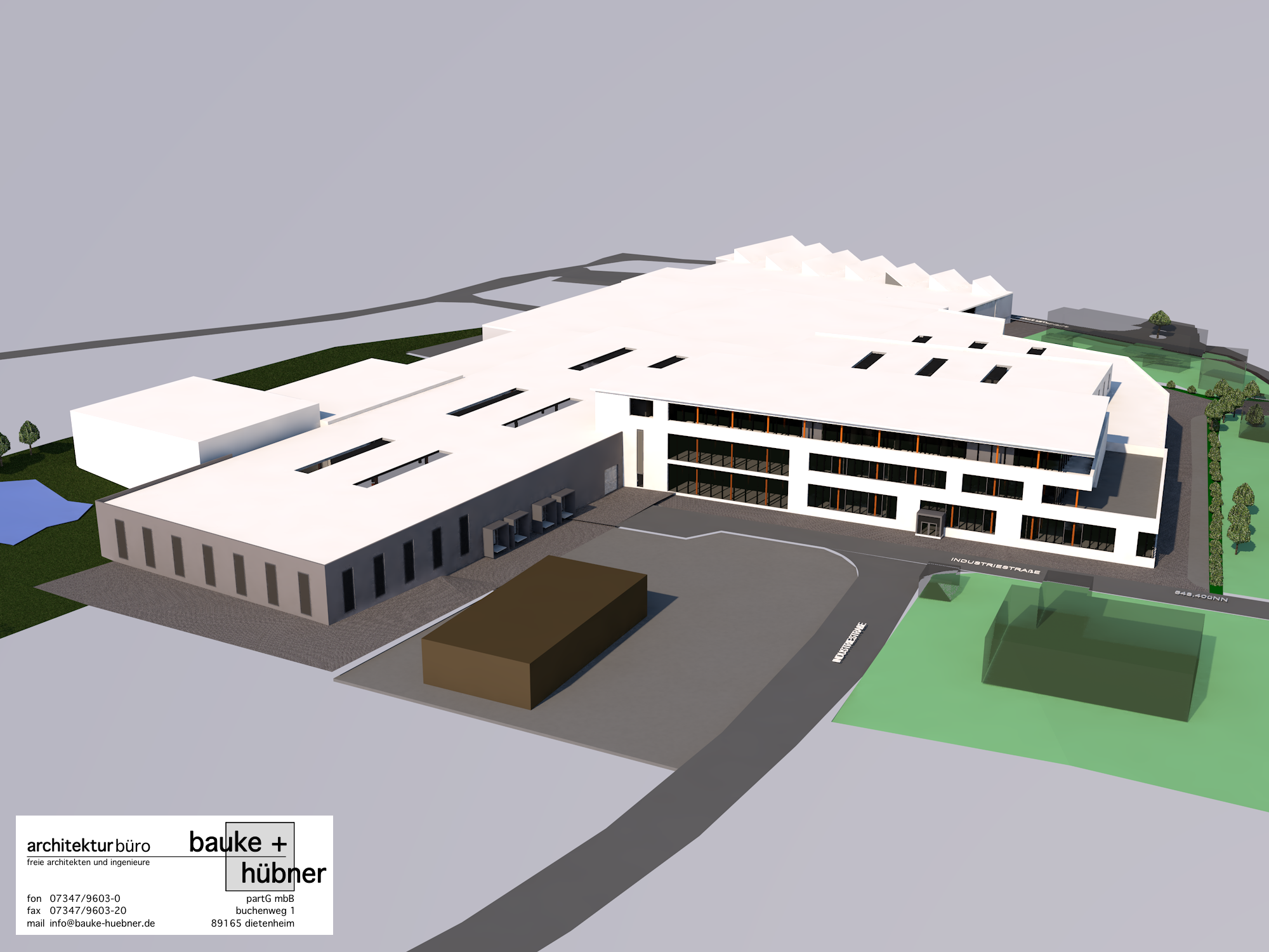 Moderne Lagerhalle mit angrenzendem Bürogebäude und Parkplatz.