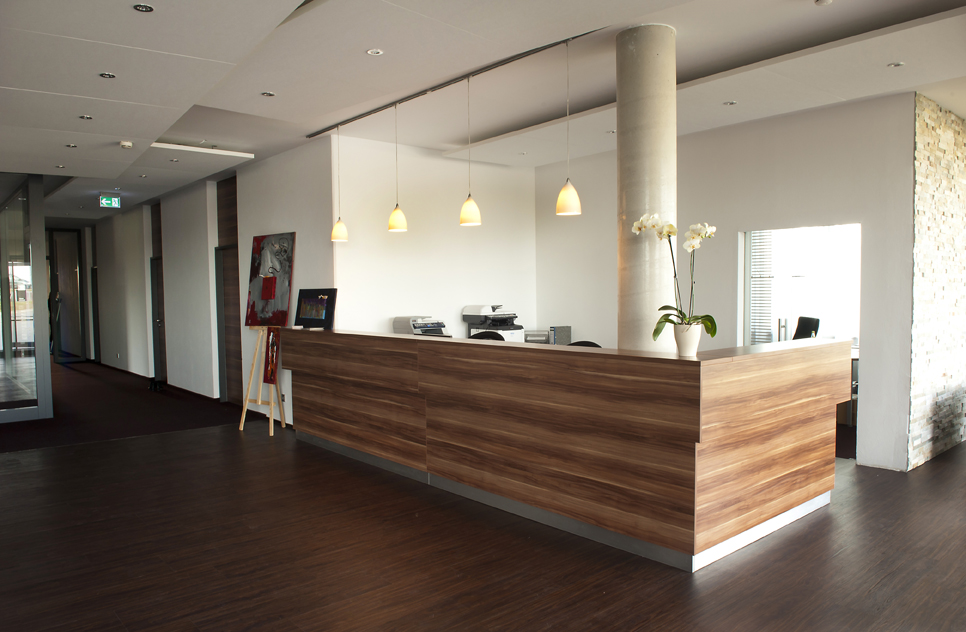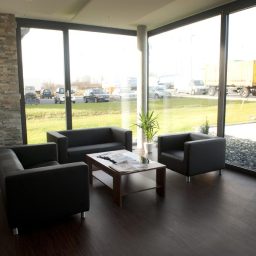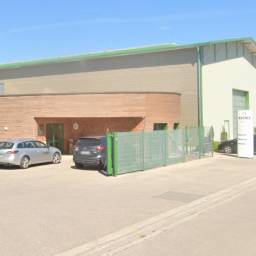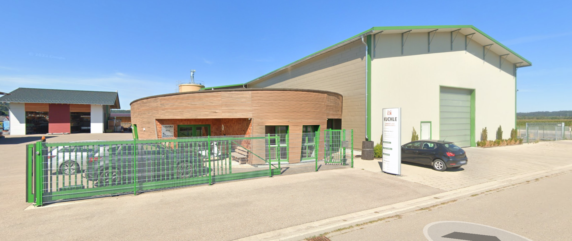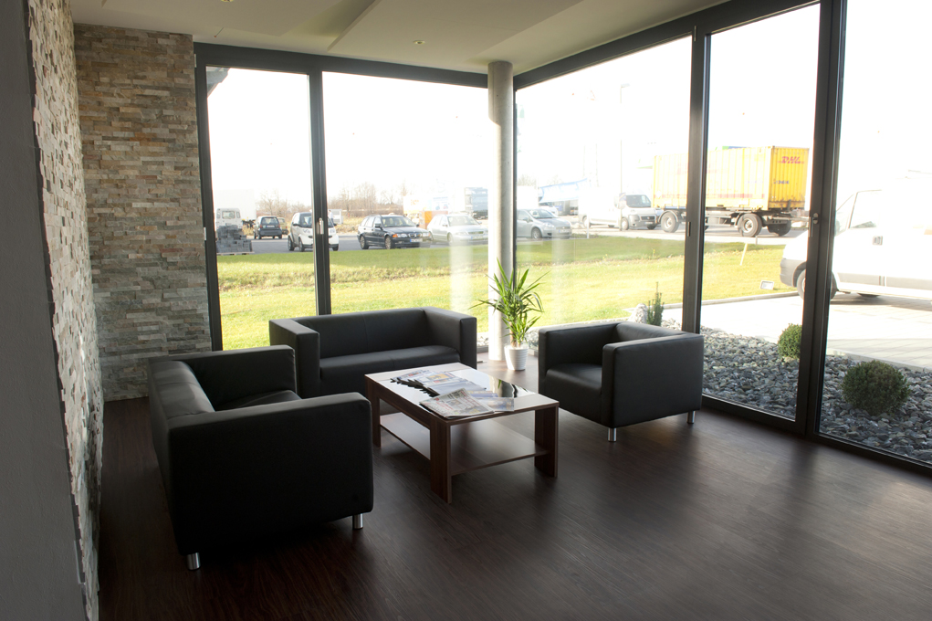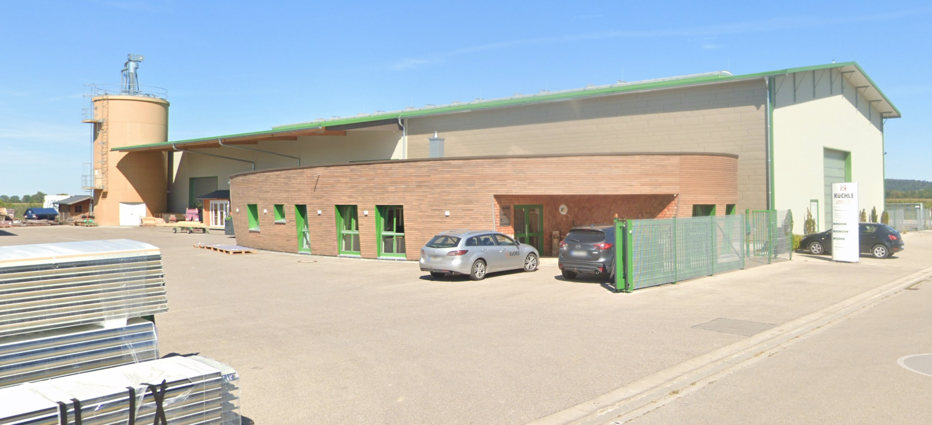 Moderne Lagerhalle mit angrenzendem Bürogebäude und Parkplatz.