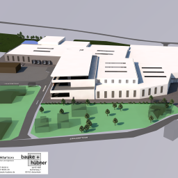 Modell eines modernen Gebäudes mit großzügigen Fensterfronten und umliegenden Landschaftselementen.
