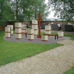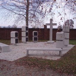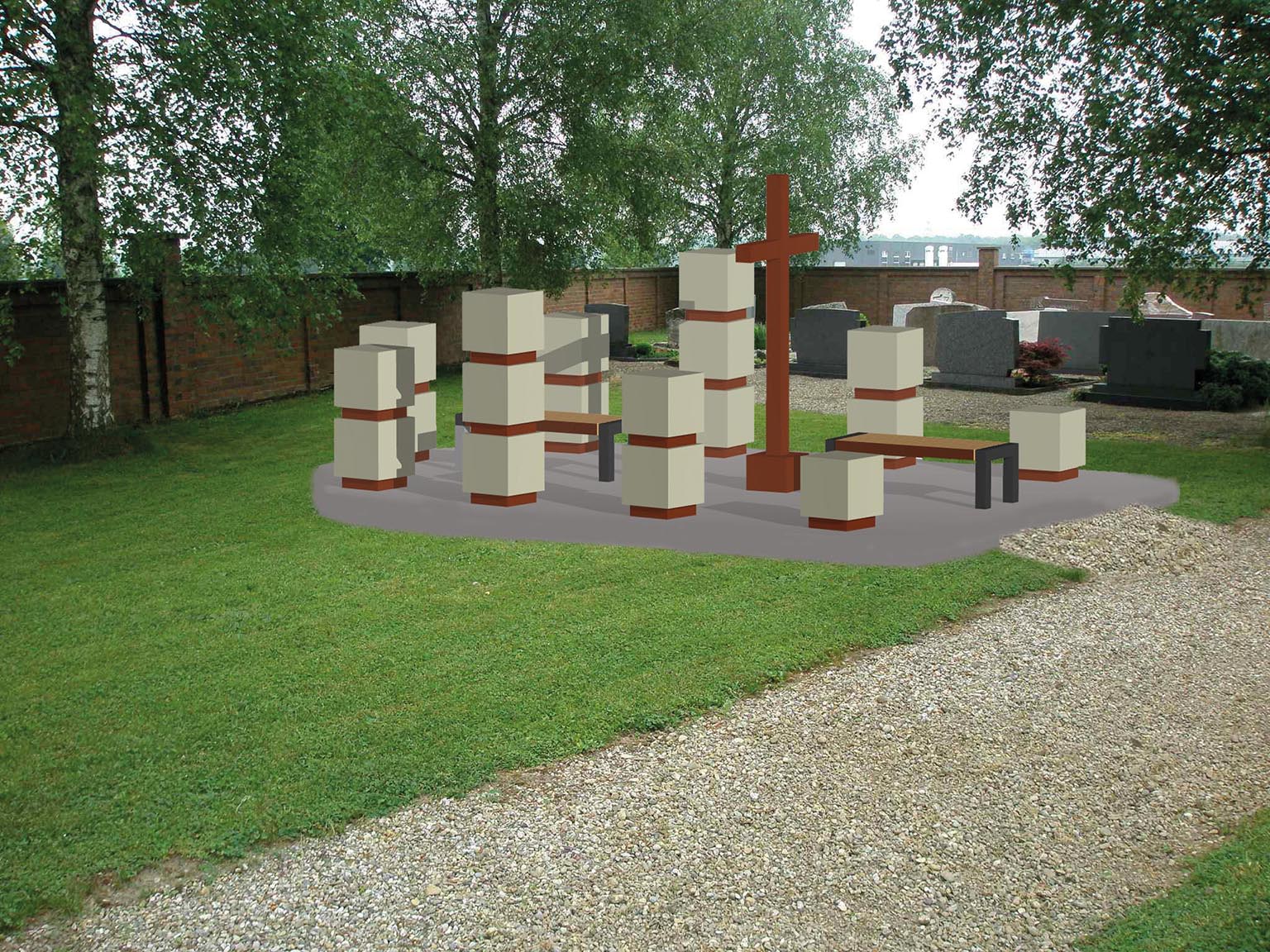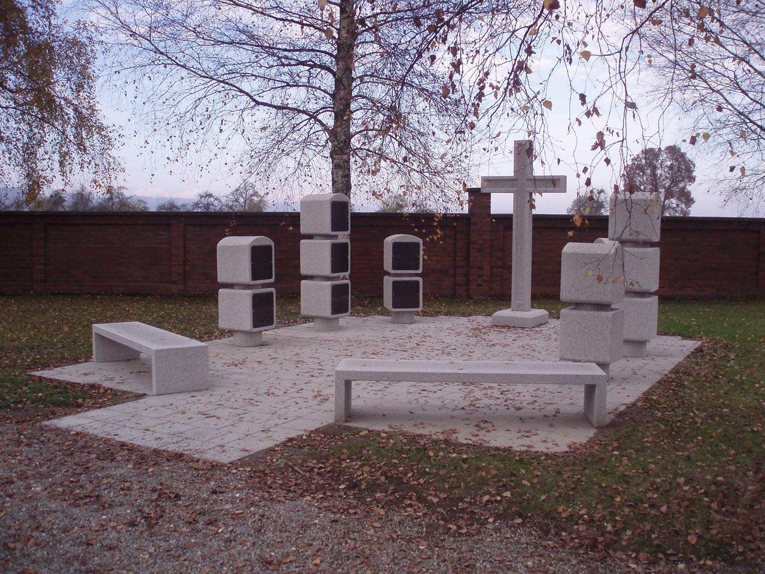 Weiße Betonbänke und kreuzförmiges Denkmal in einem ruhigen, begrenzten Raum.