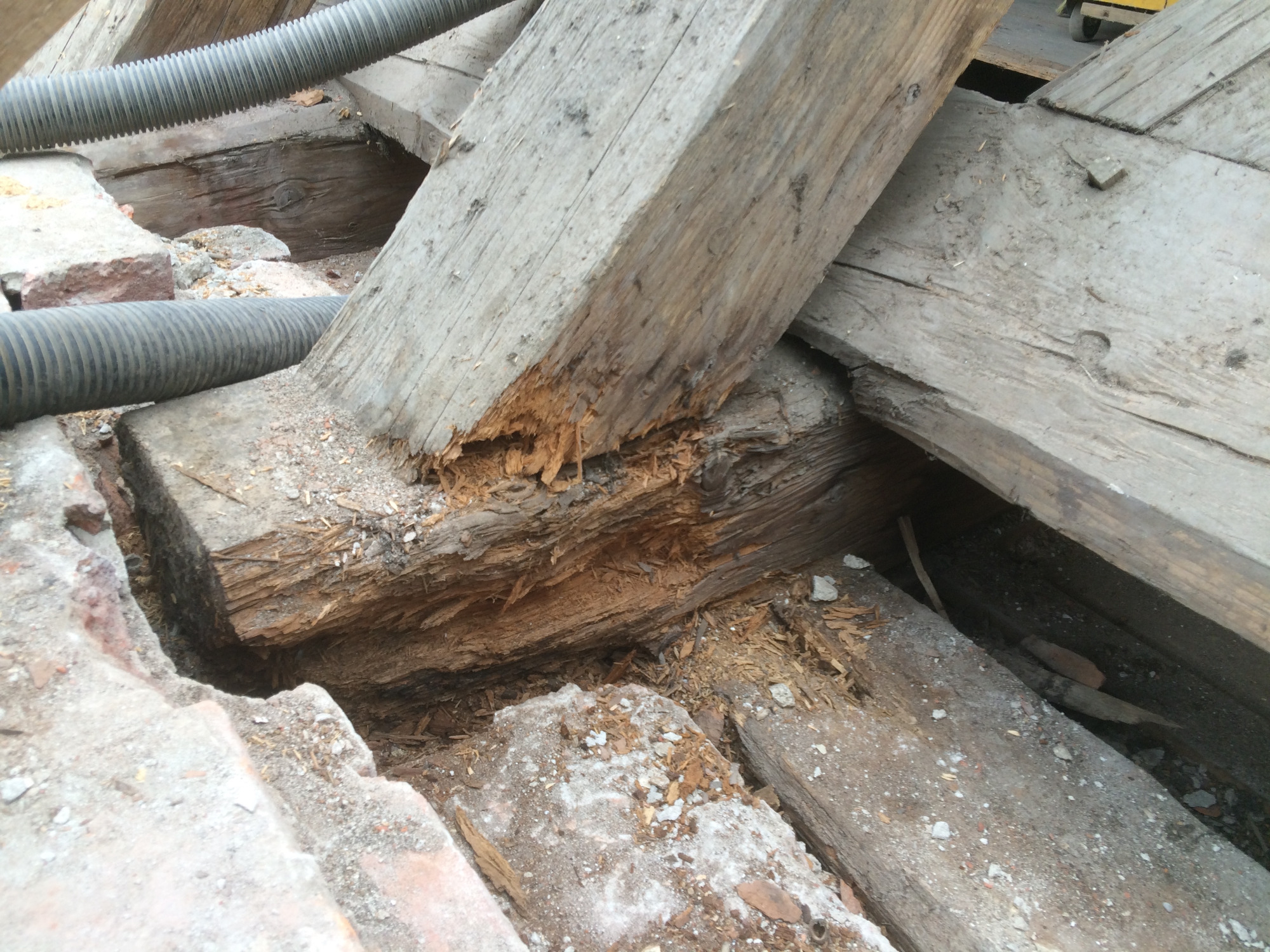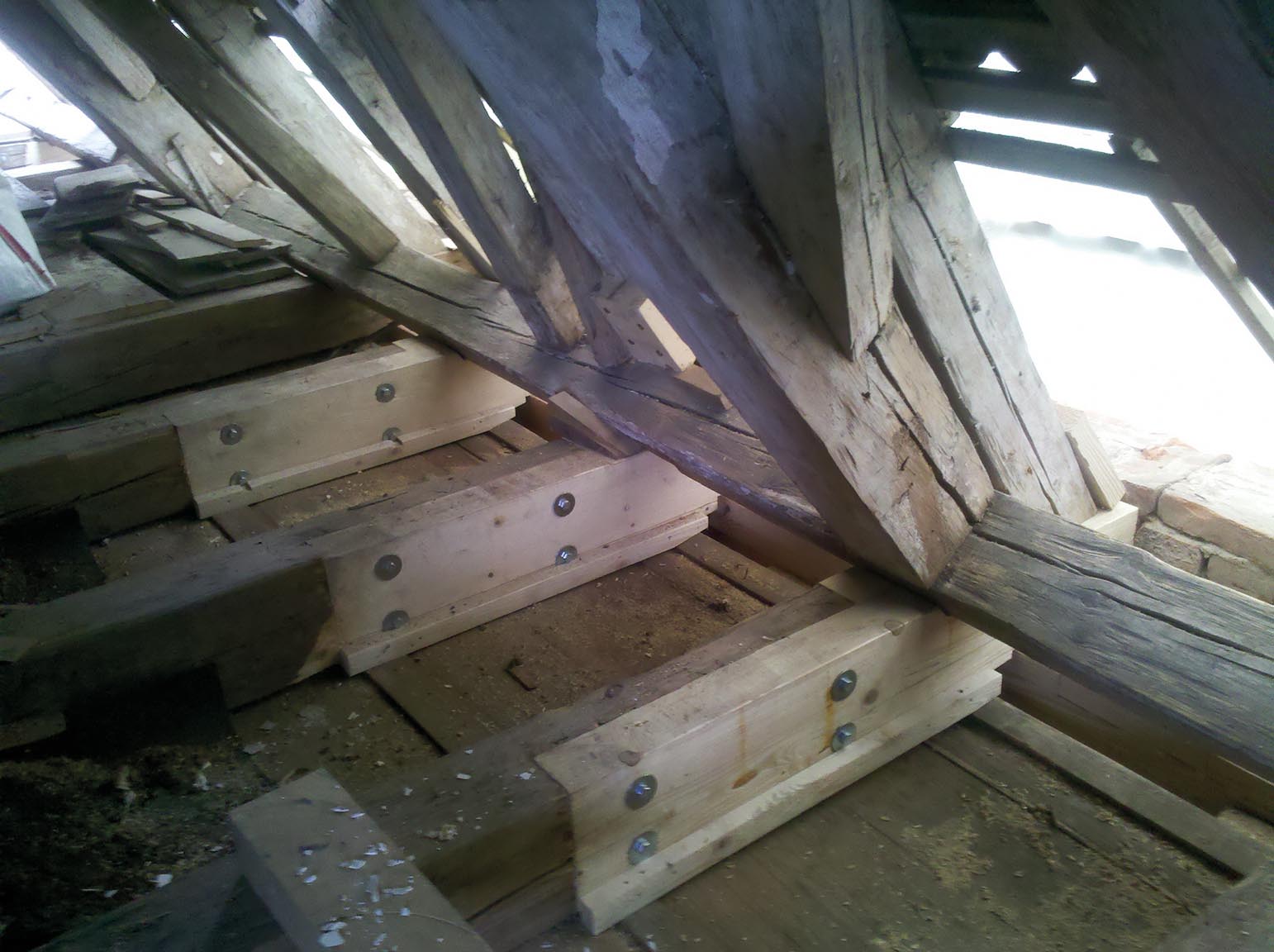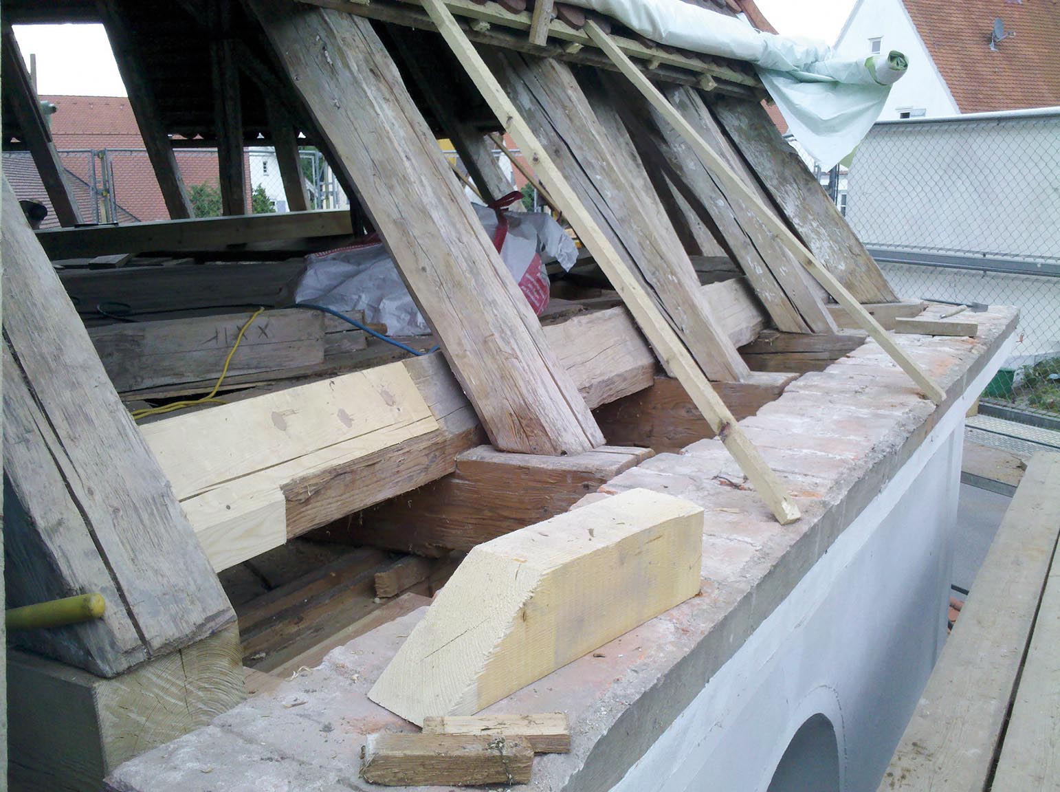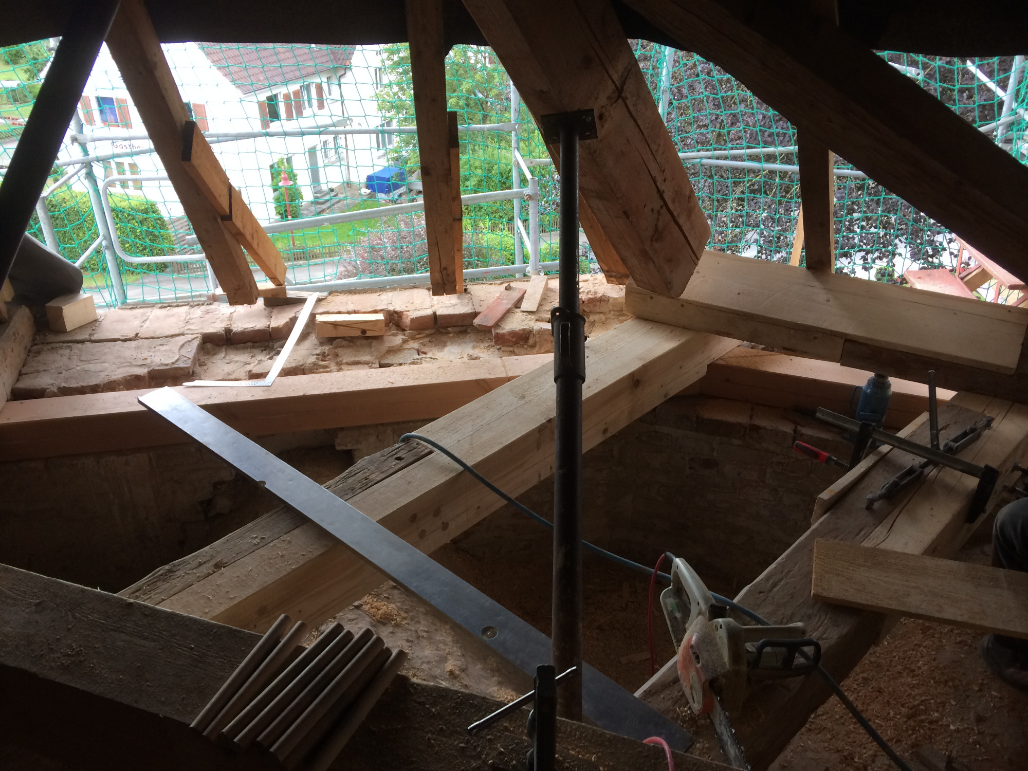 Blick auf das Dachgeschoss mit Holzbalken, Baugeräten und Baustellenumgebung.