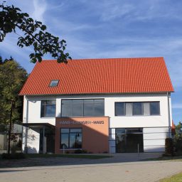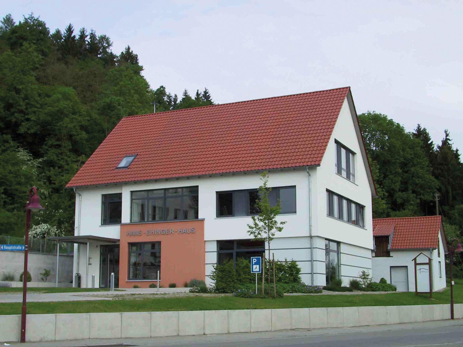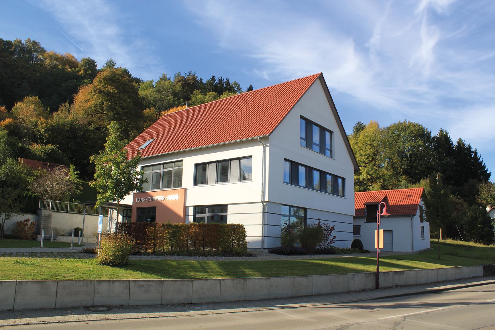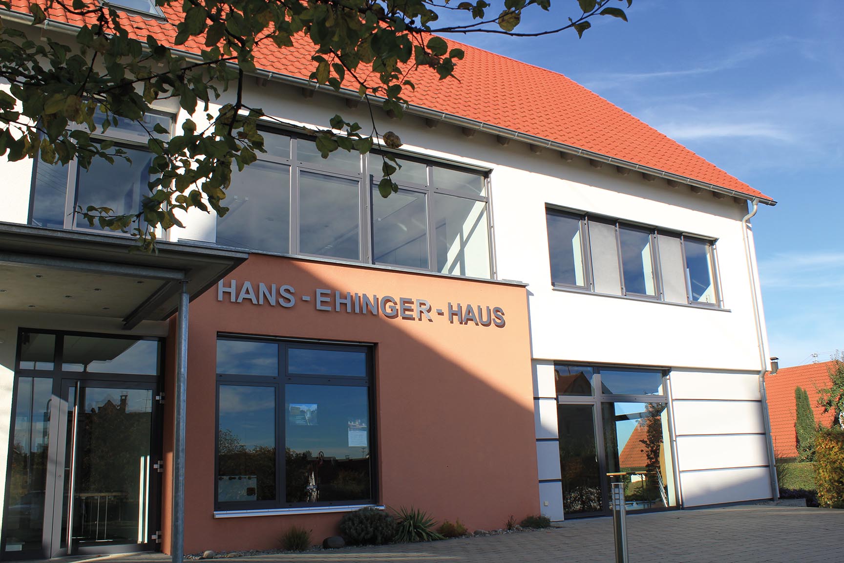 Eingang zum Hans-Ehinger-Haus mit moderner Architektur und großen Fenstern.
