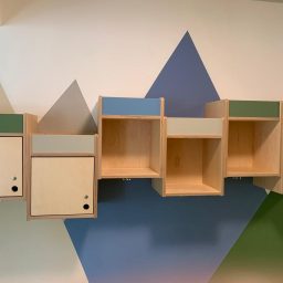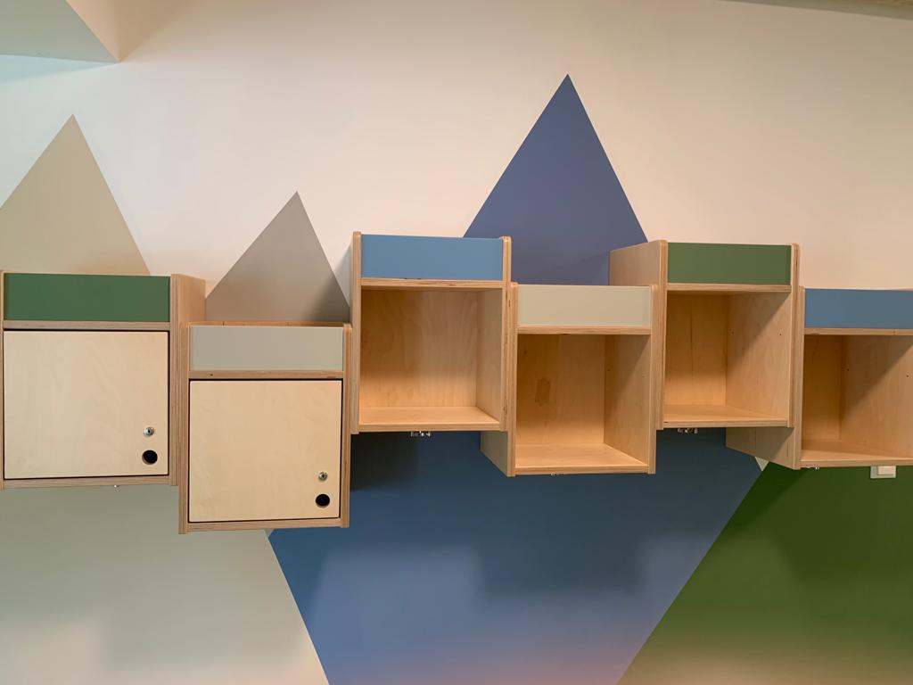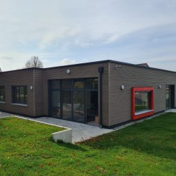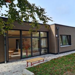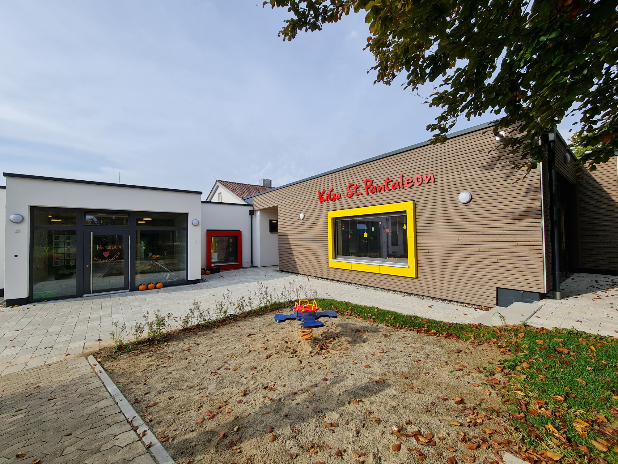 Modernes Gebäude mit buntem Spielplatz und großzügigen Fenstern.