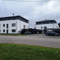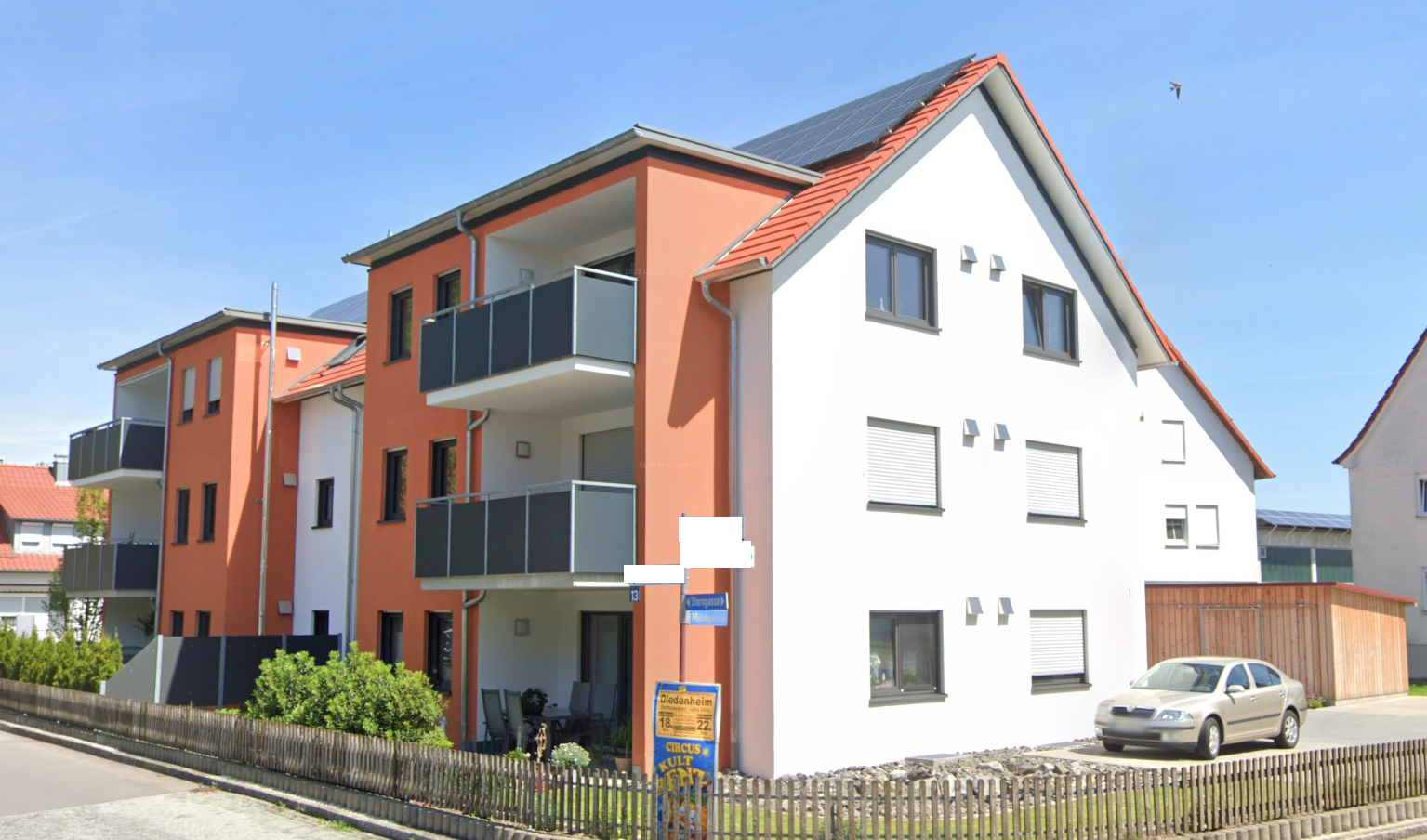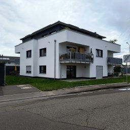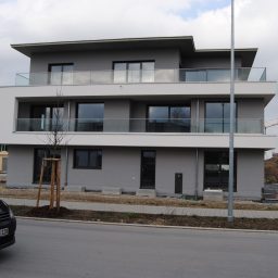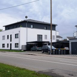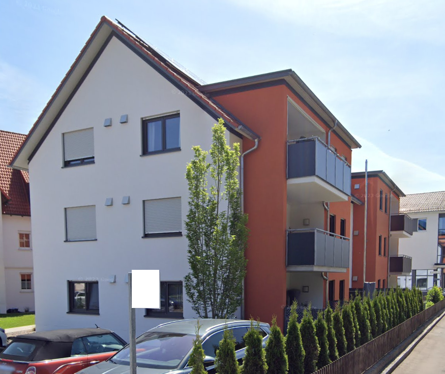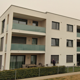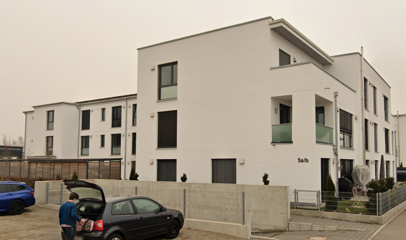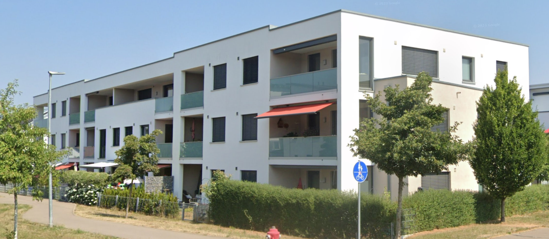 Modernes, mehrstöckiges Wohnhaus mit Balkon und grauer Fassade in einer Wohngegend.