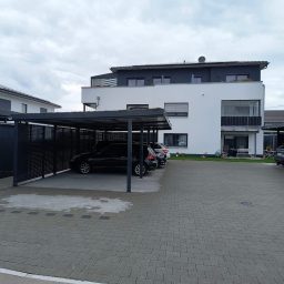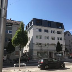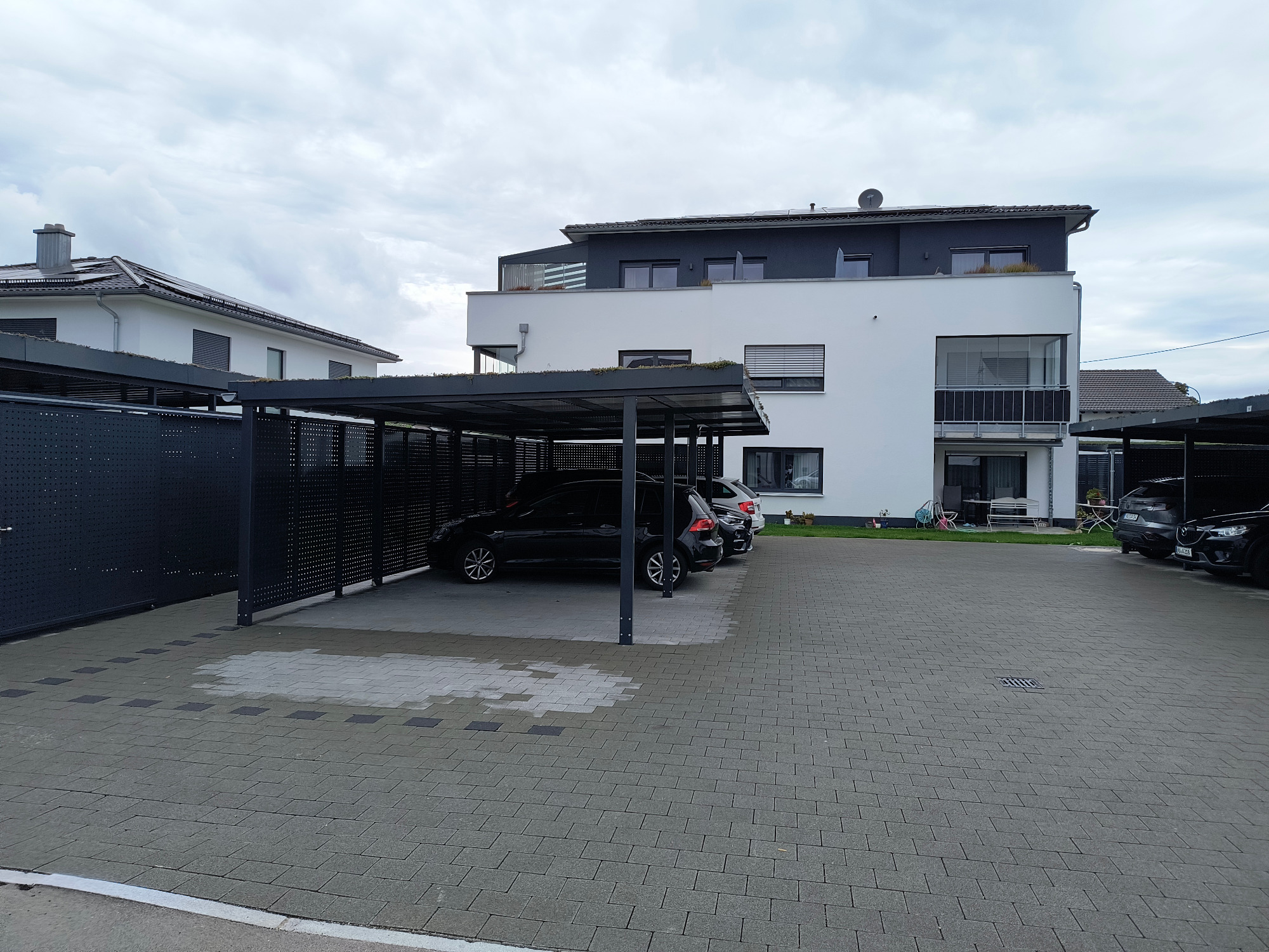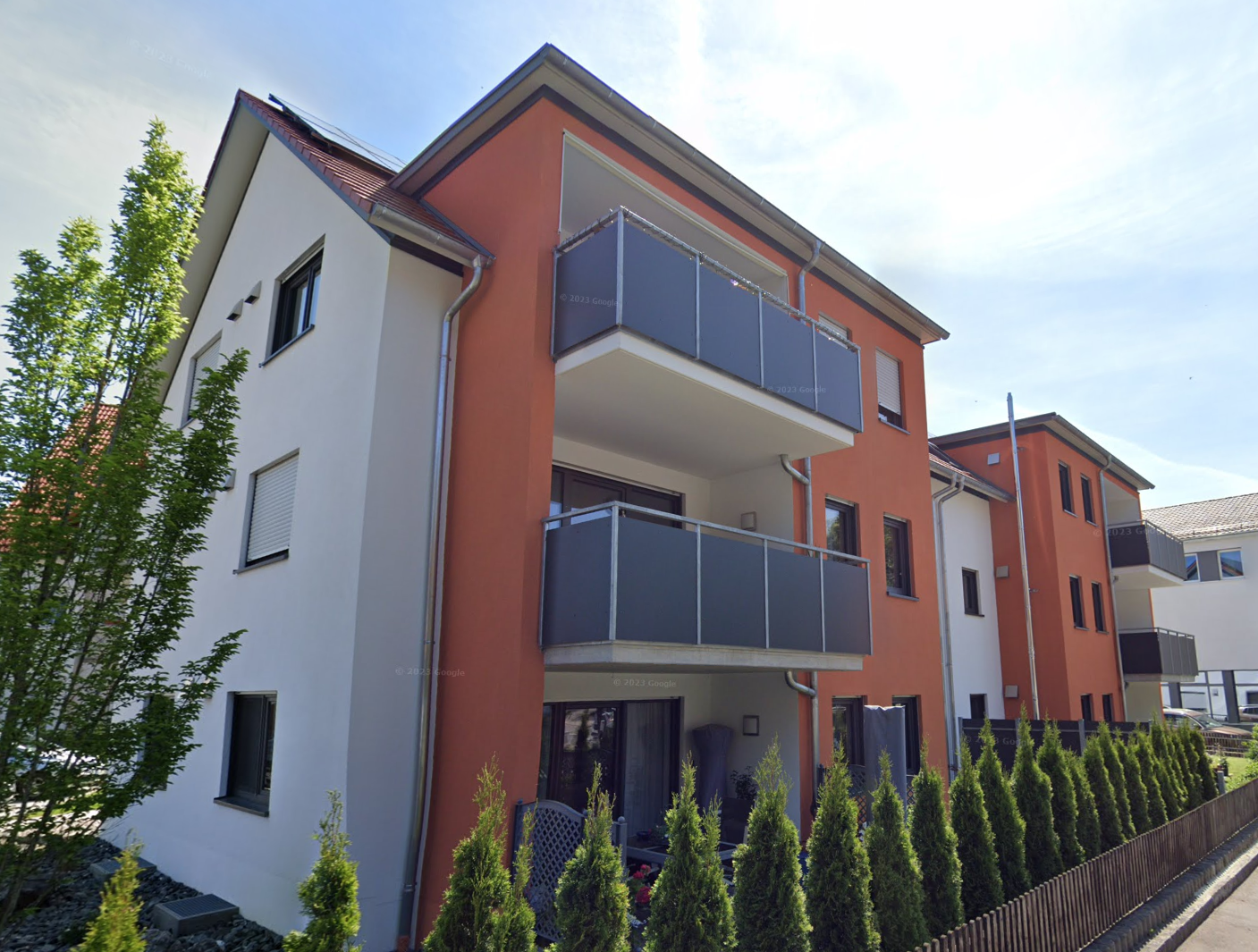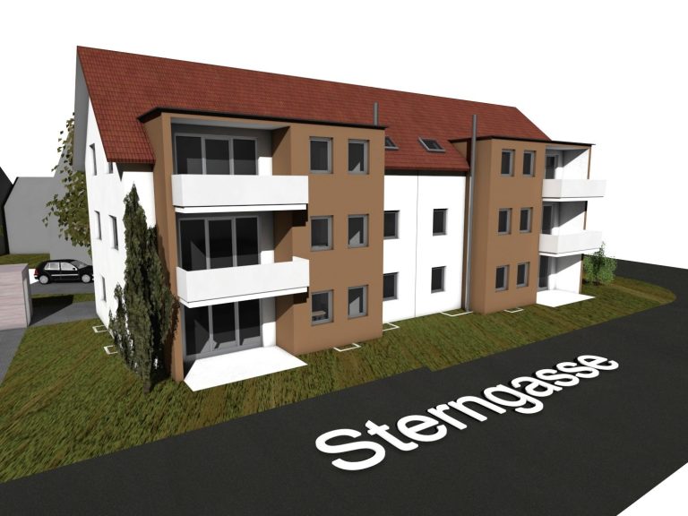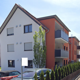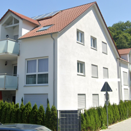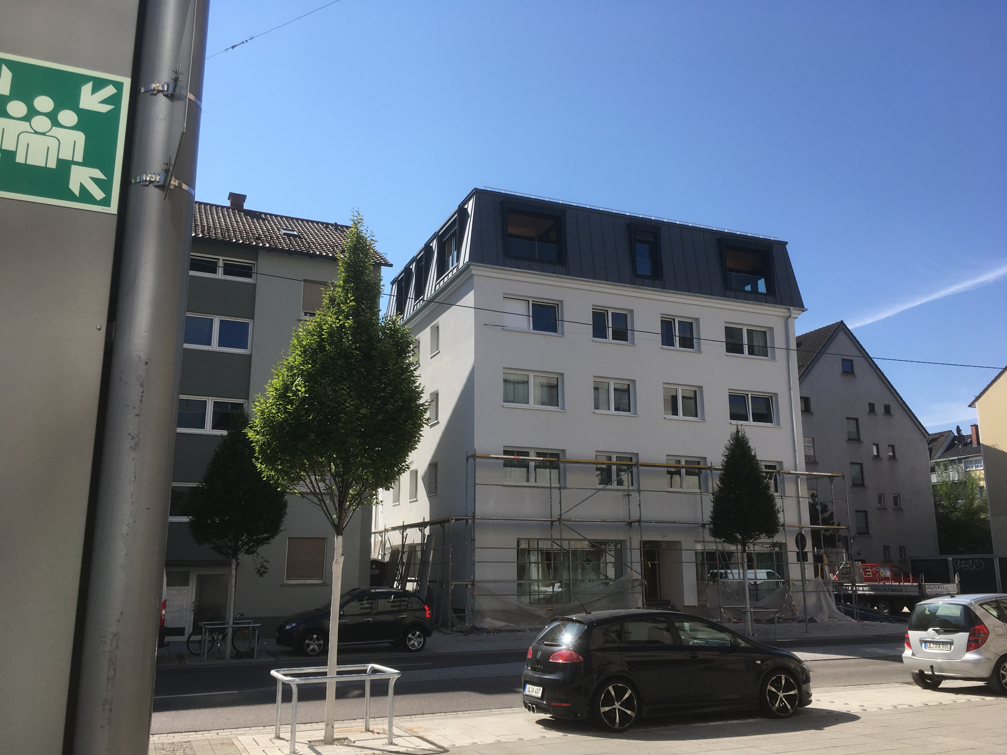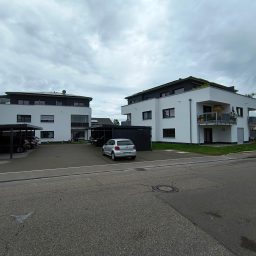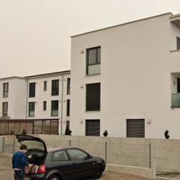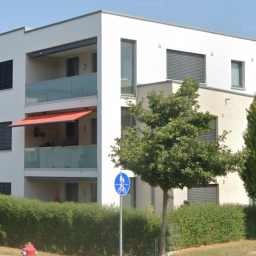 Modernes, mehrstöckiges Wohnhaus mit Balkon und grauer Fassade in einer Wohngegend.