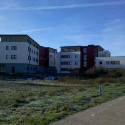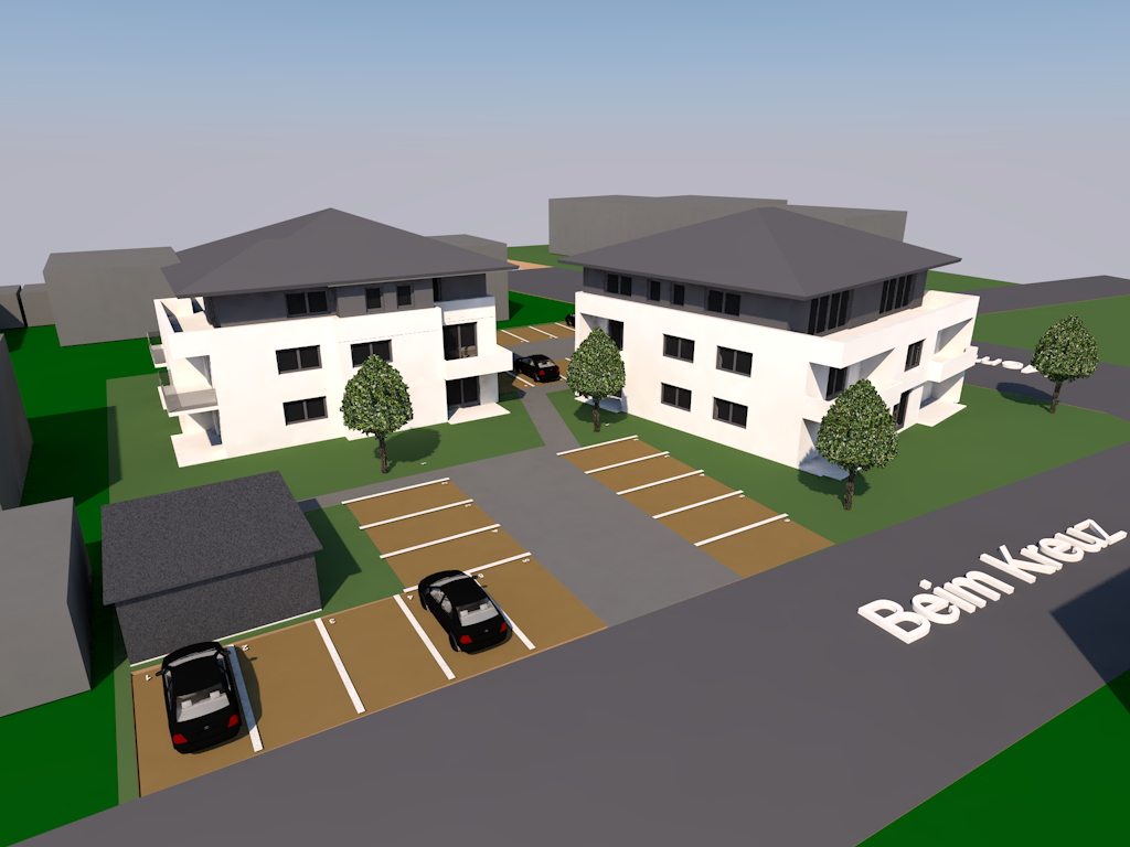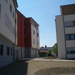 Moderne Wohngebäude mit roten Dächern und Grünflächen zwischen den Häusern.