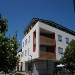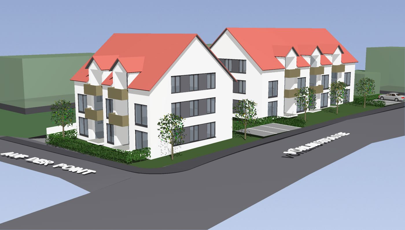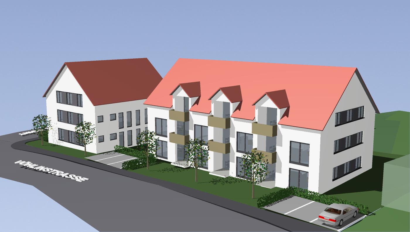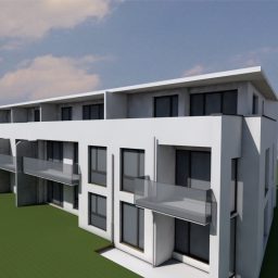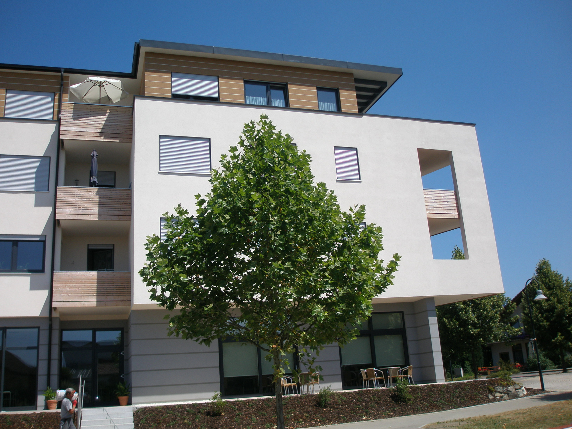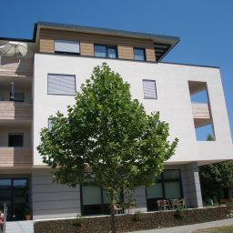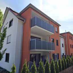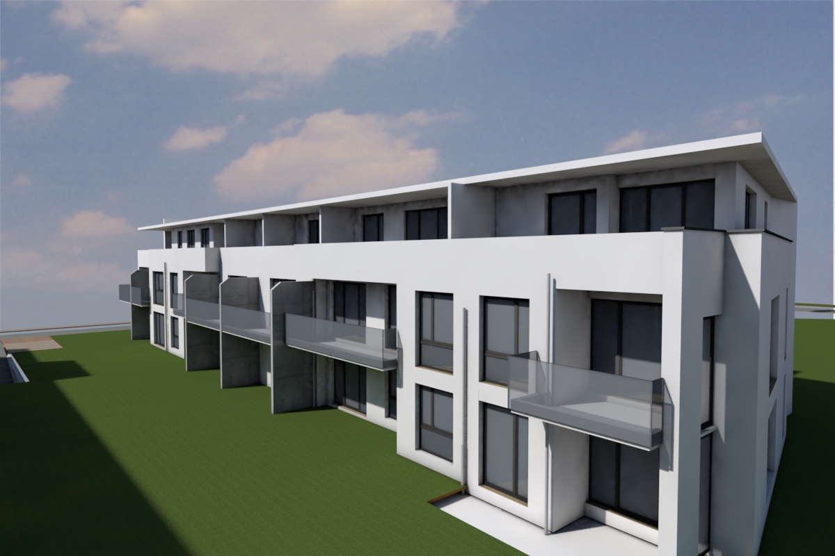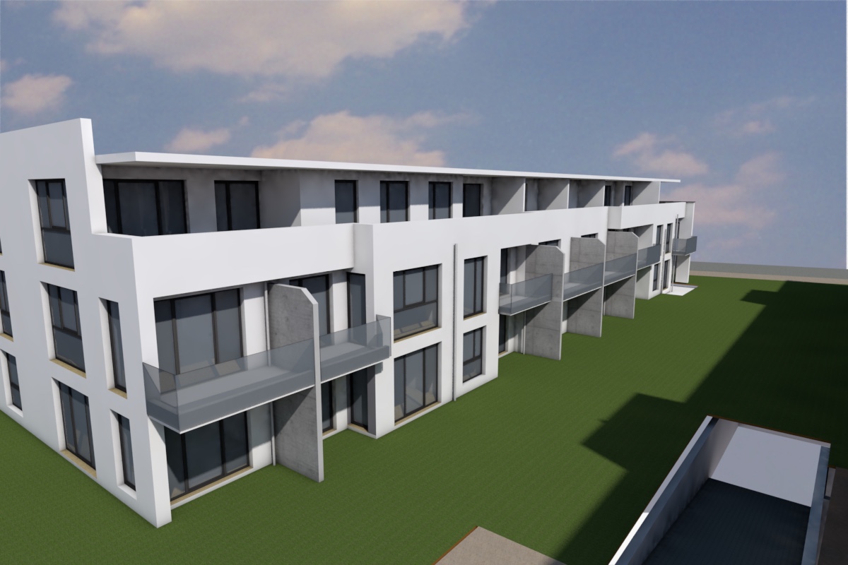 Moderne Wohngebäude mit zwei Balkonen und einem begrünten Außenbereich.