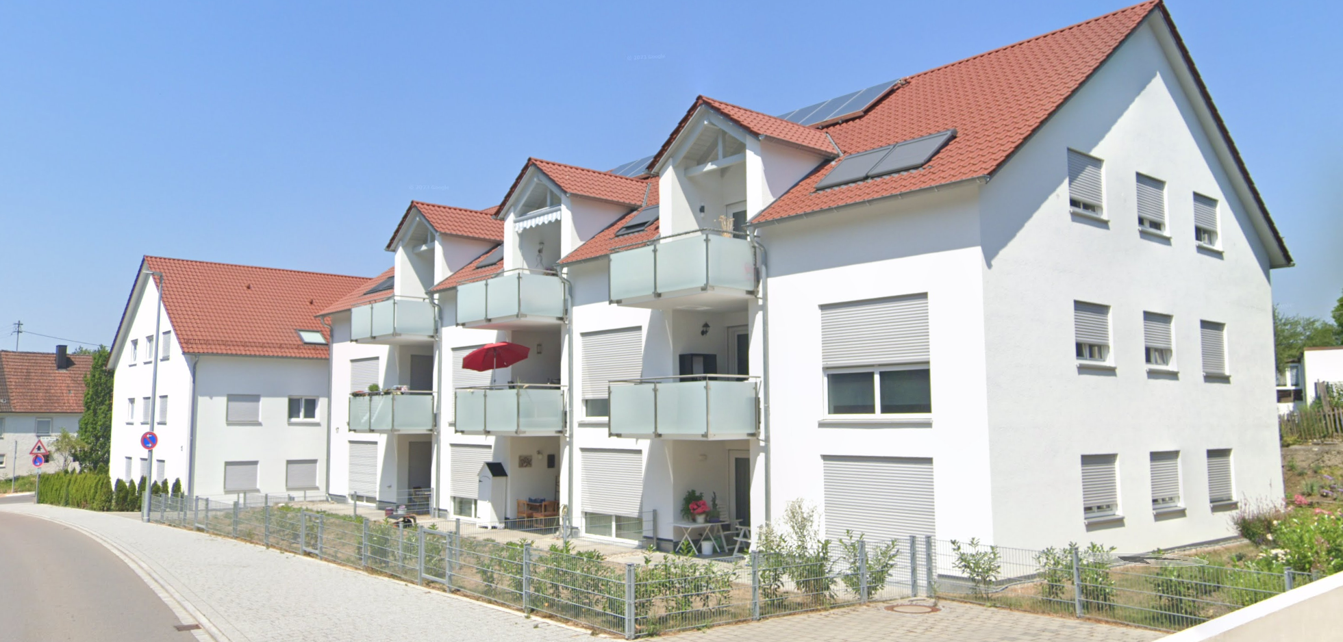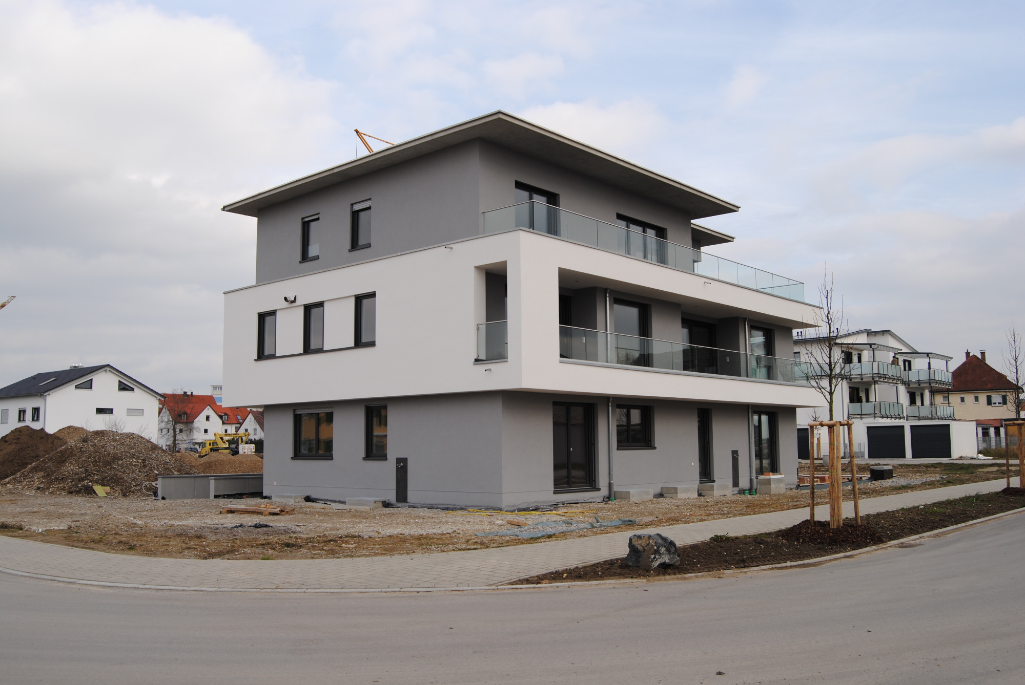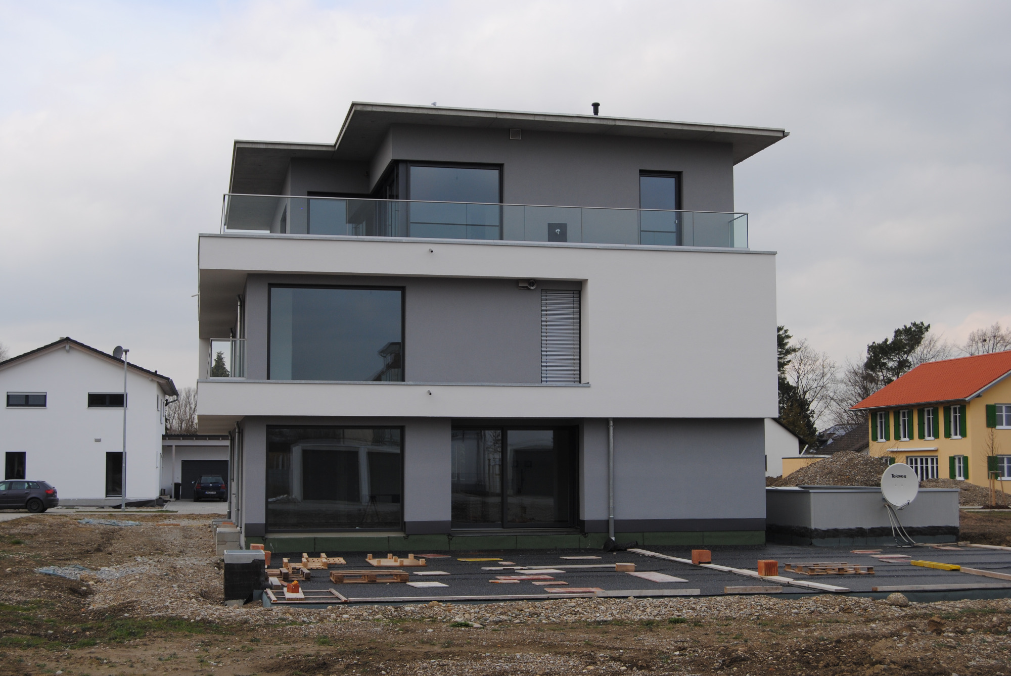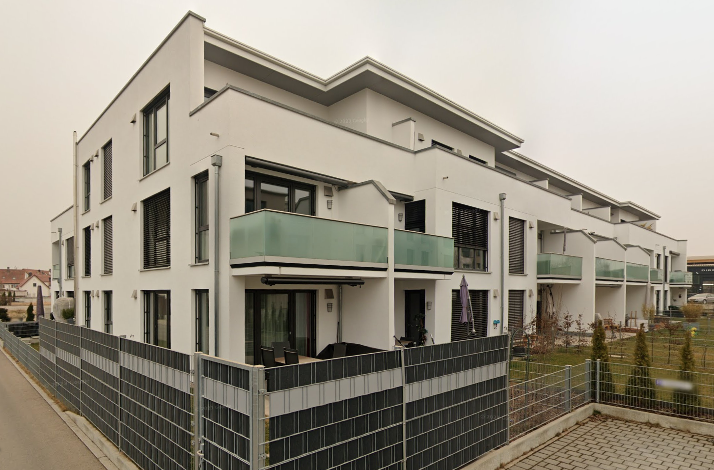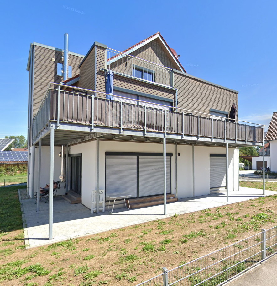 Modernes Wohnhaus mit Hausbalkon und Rollläden im Erdgeschoss.