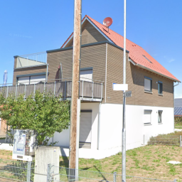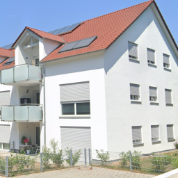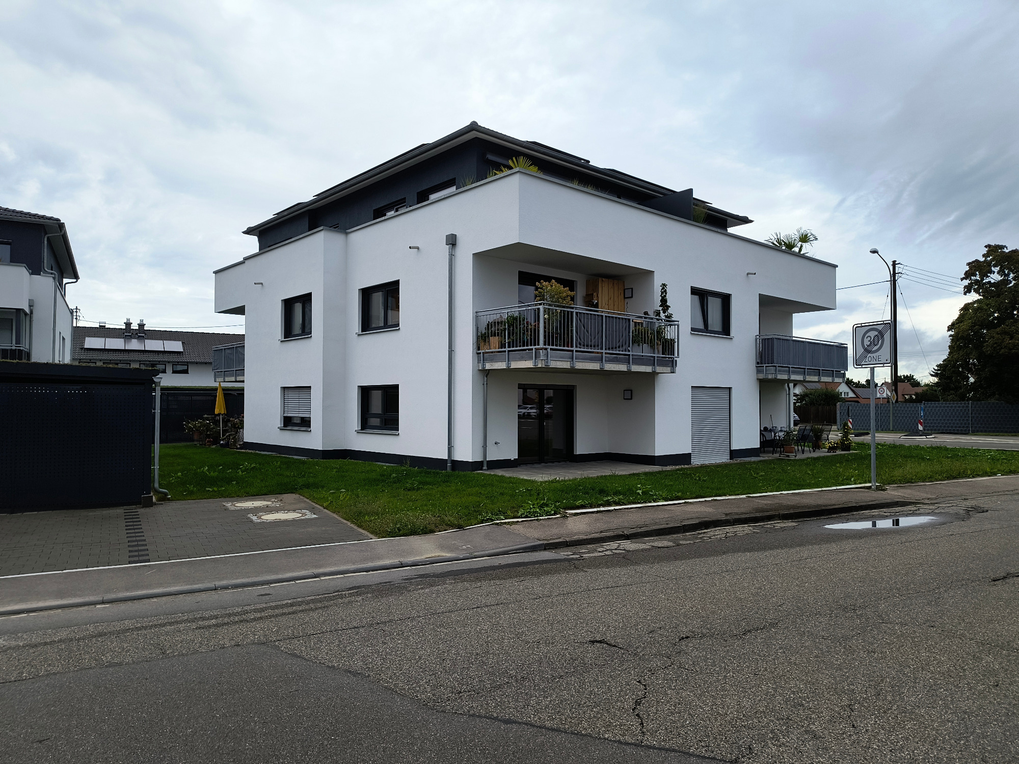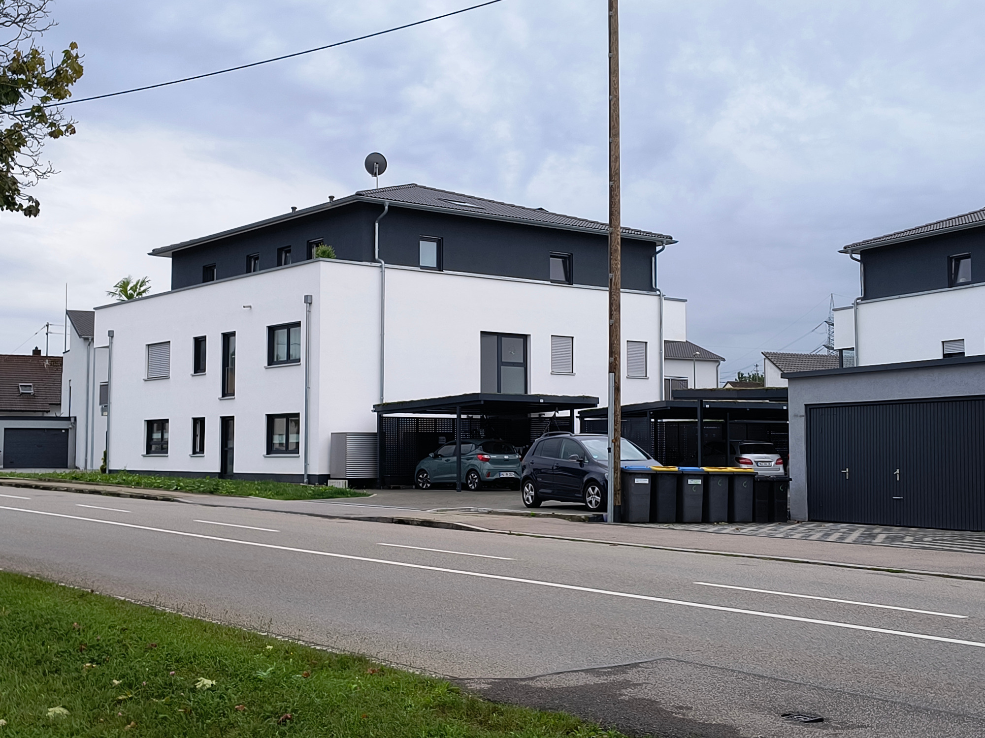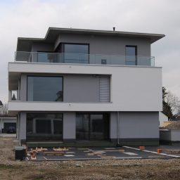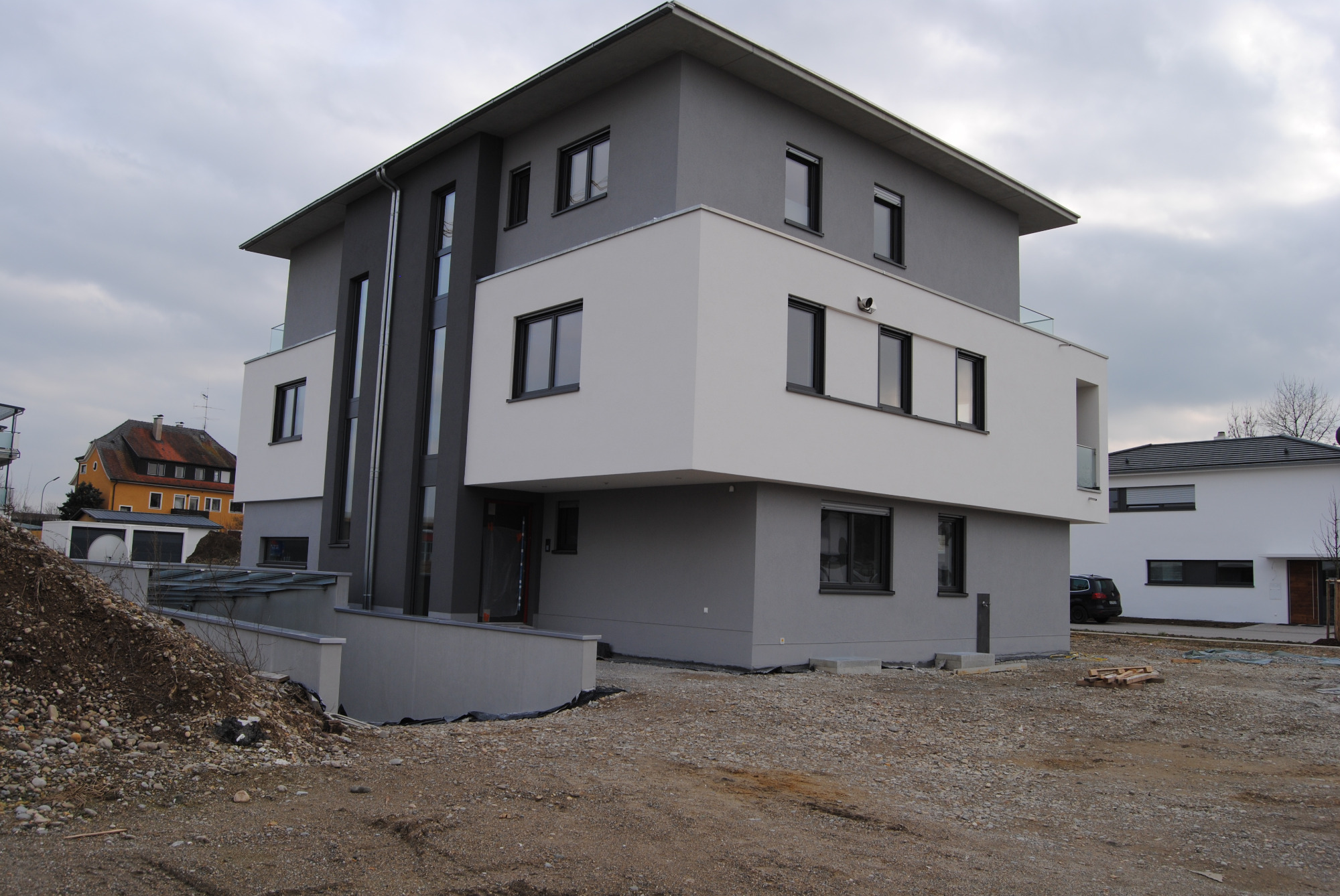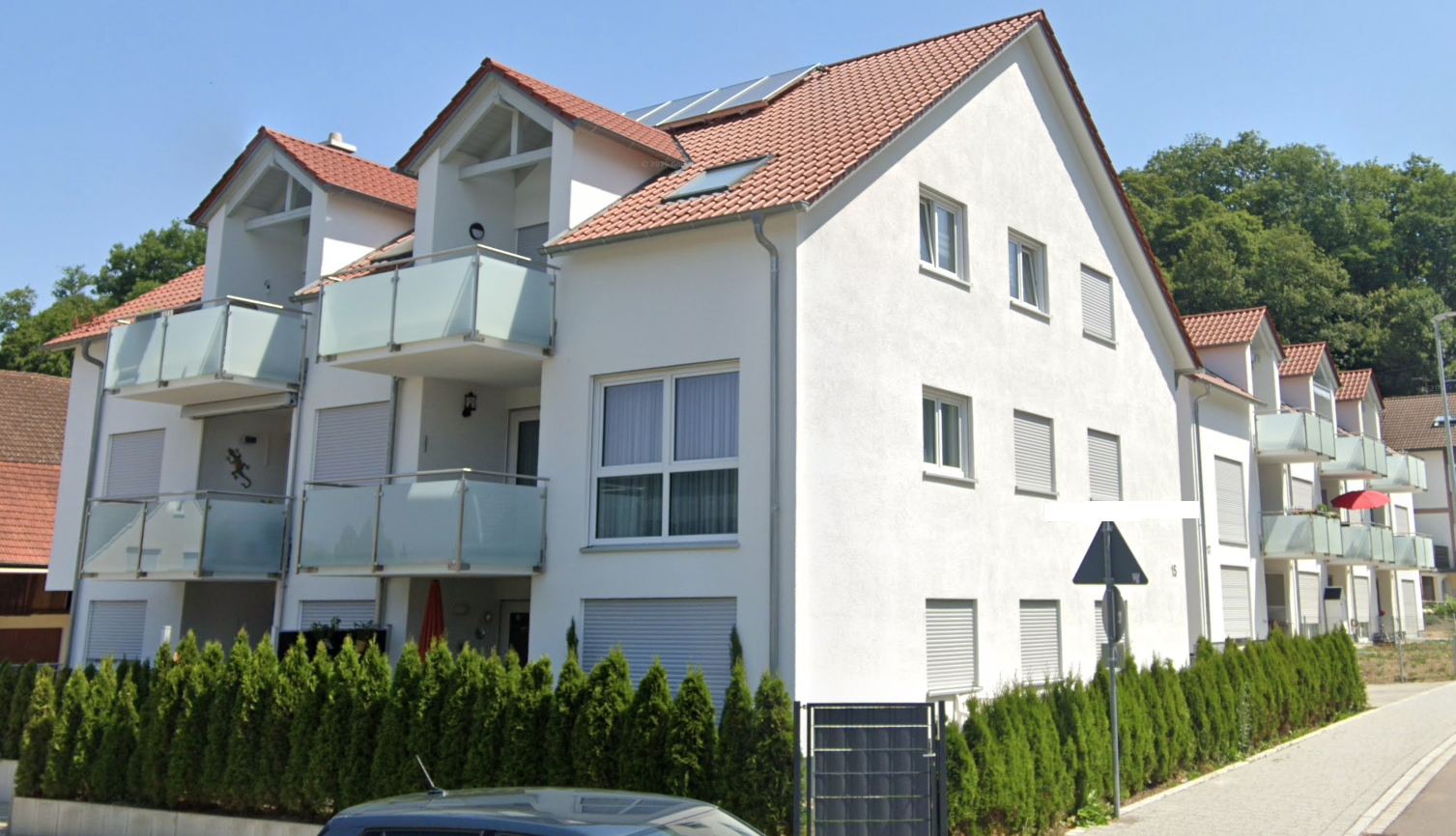 Modernes Wohnhaus mit Hausbalkon und Rollläden im Erdgeschoss.