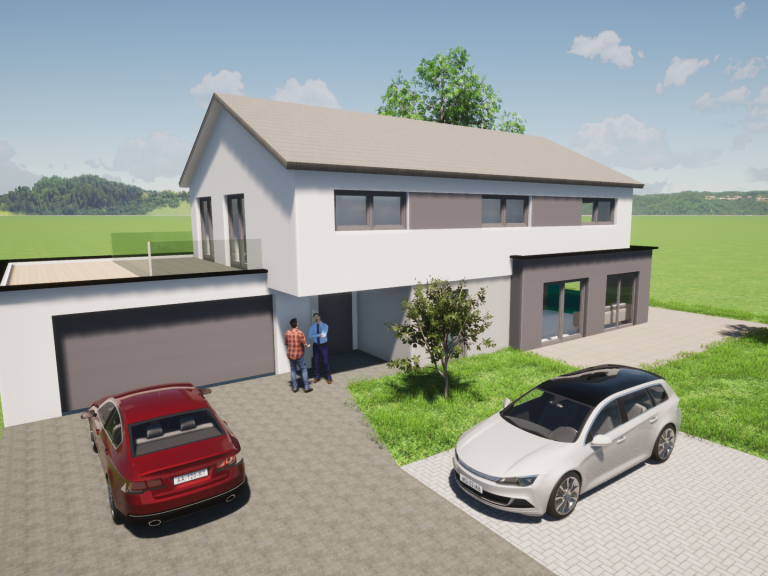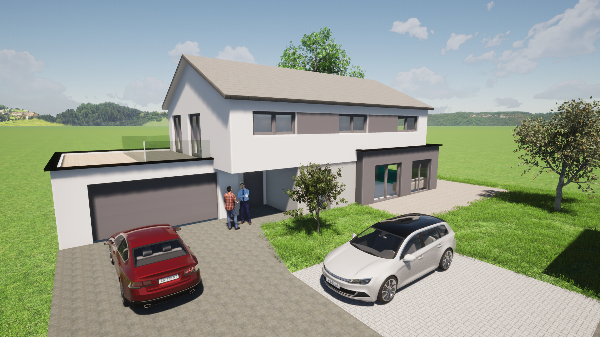 Modernes, weißes Wohnhaus mit Garage und grüner Umgebung unter bewölktem Himmel.