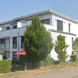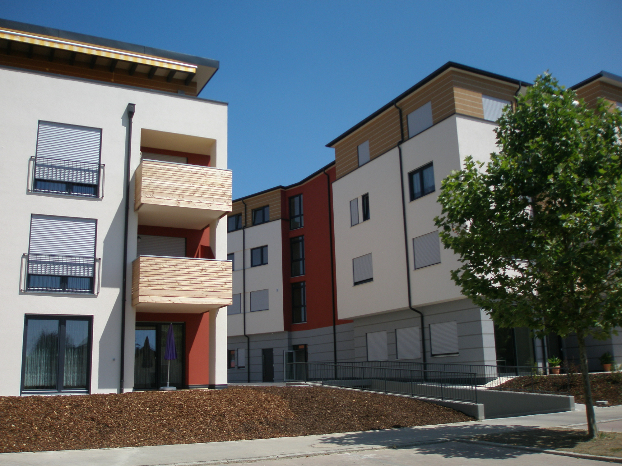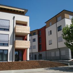 Moderne Wohnanlage mit mehreren Etagen und grünen Bäumen davor.