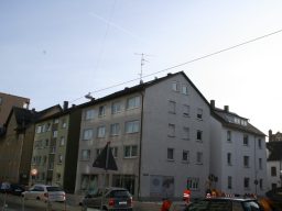 Mehrstöckiges Wohngebäude mit vielen Fenstern und Antenne auf dem Dach.