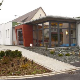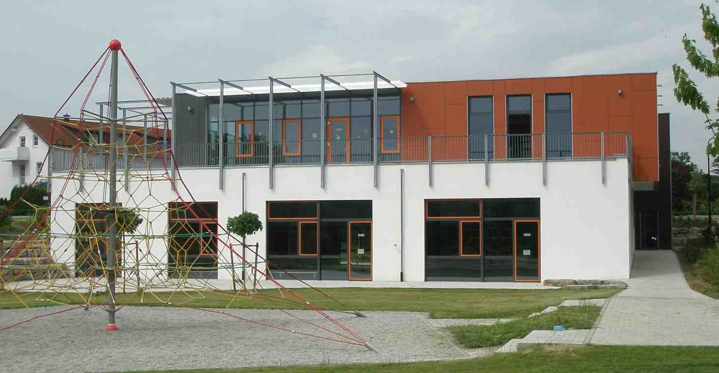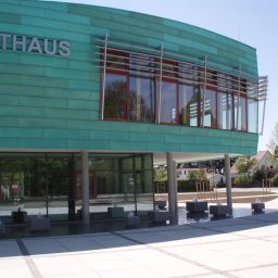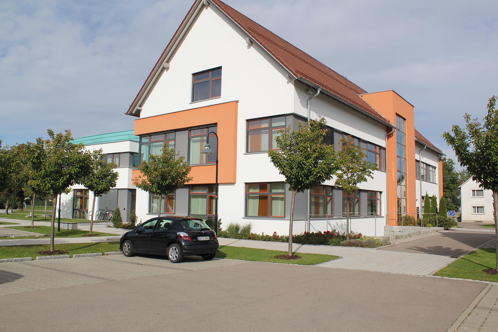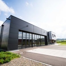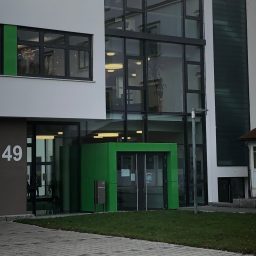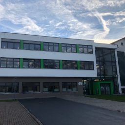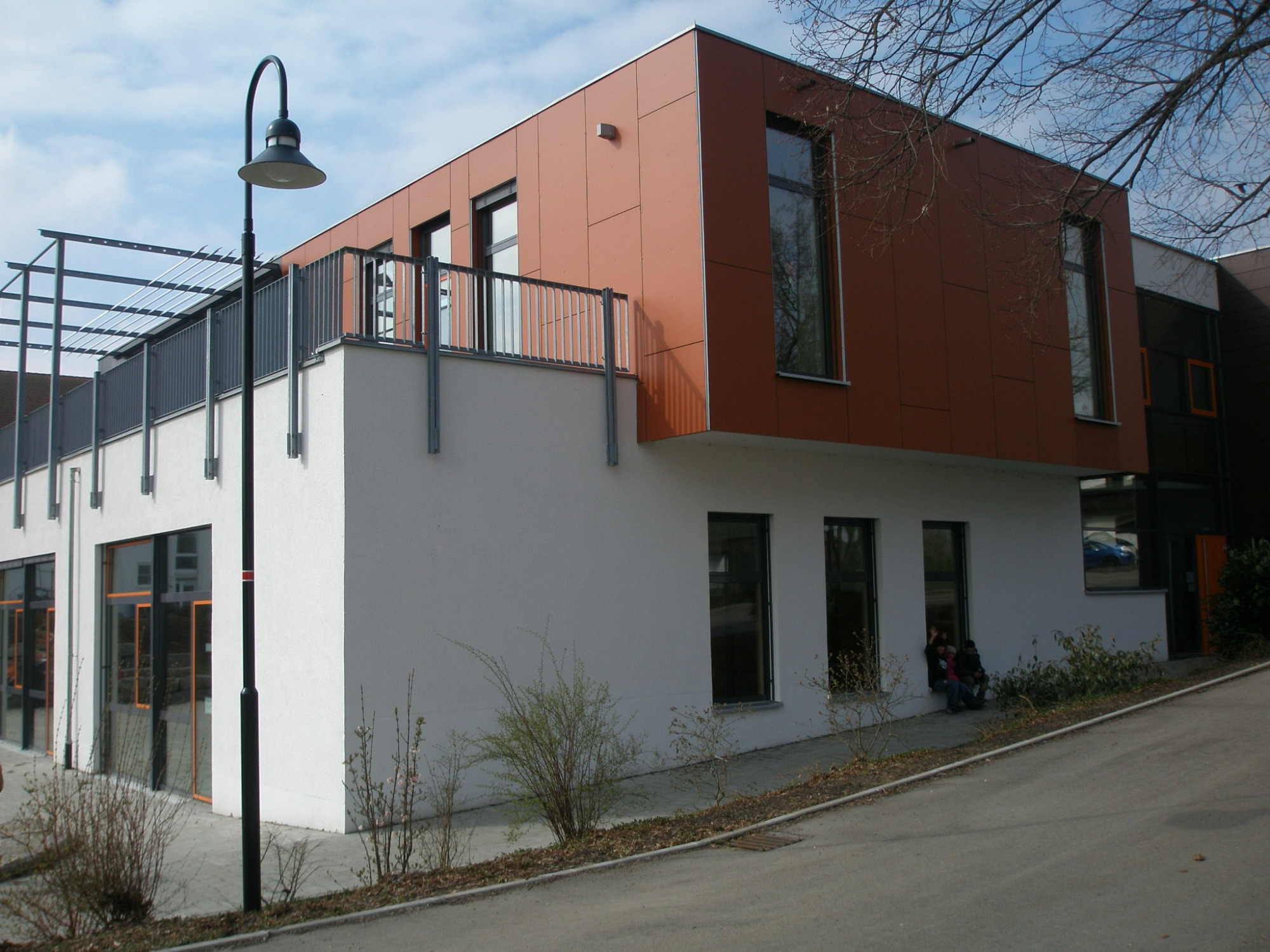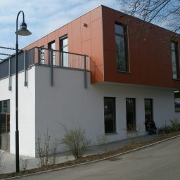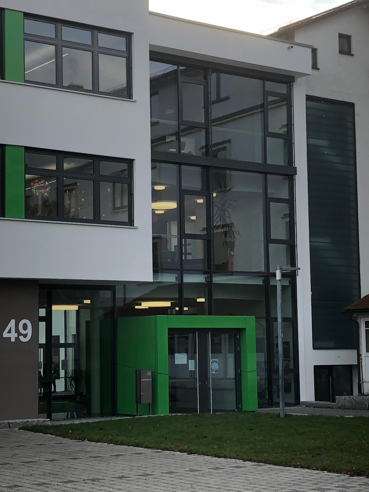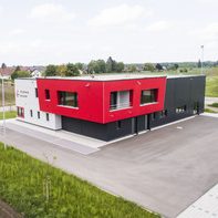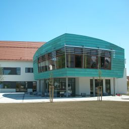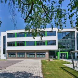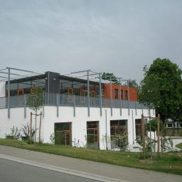 Moderne Gebäude mit großer Fensterfront, orangefarbenem Akzent und Grünflächen davor.