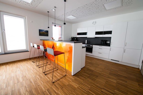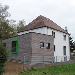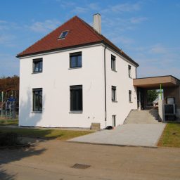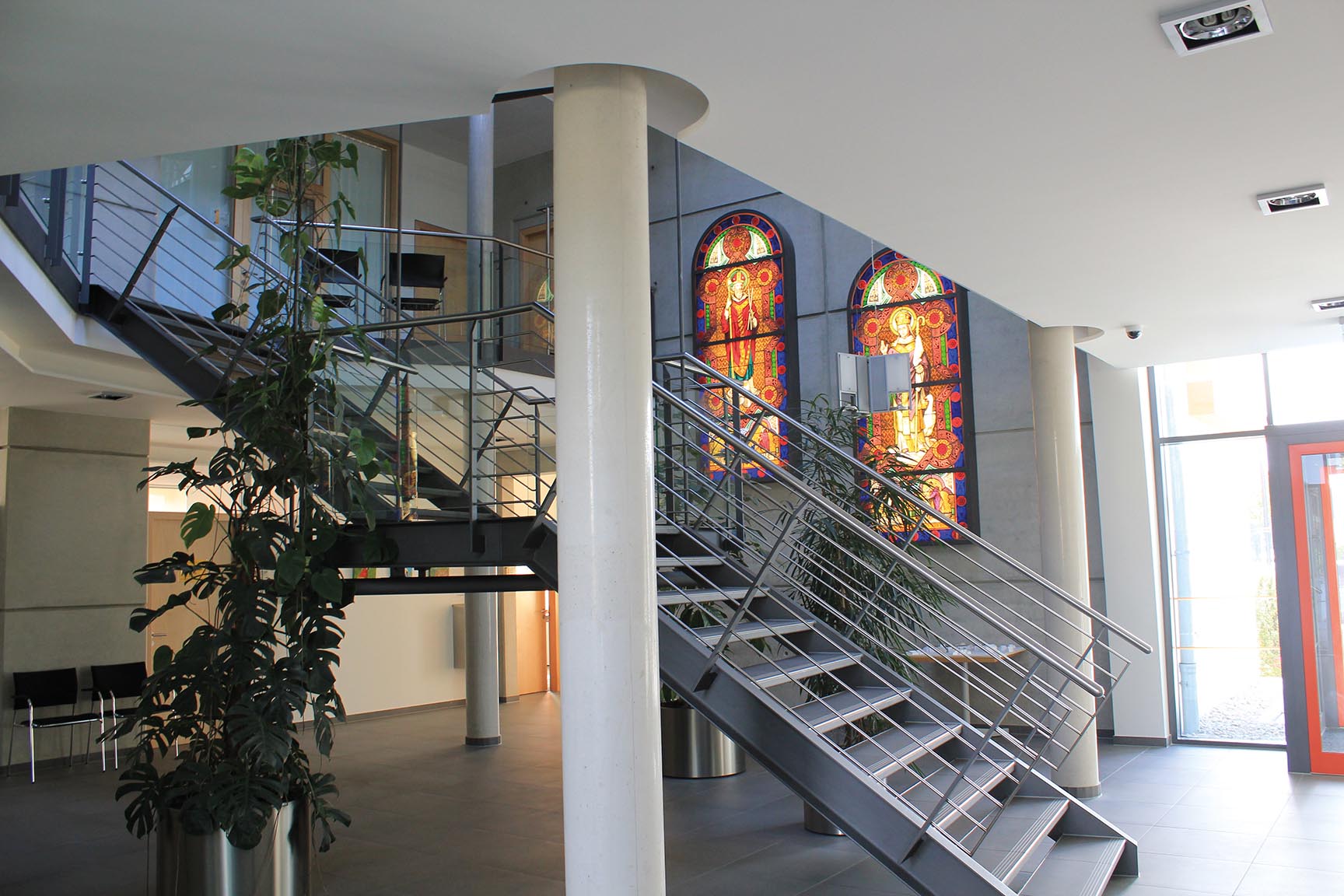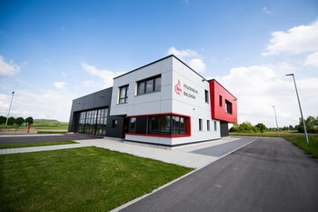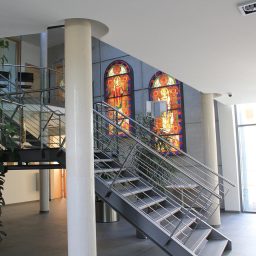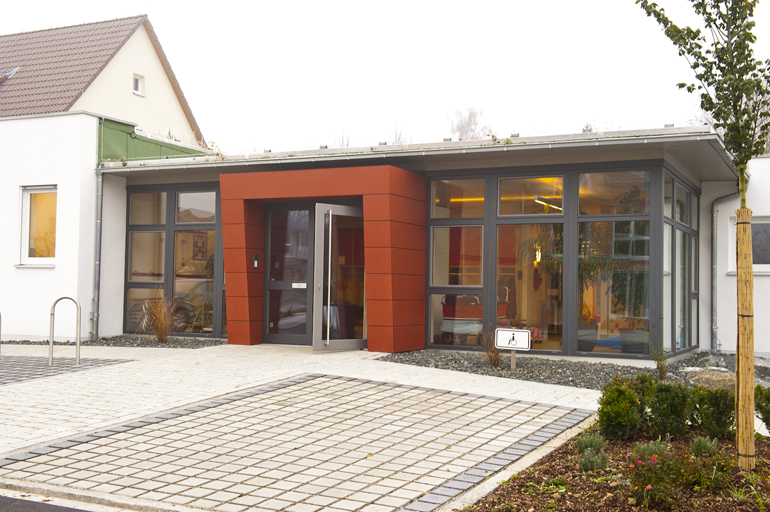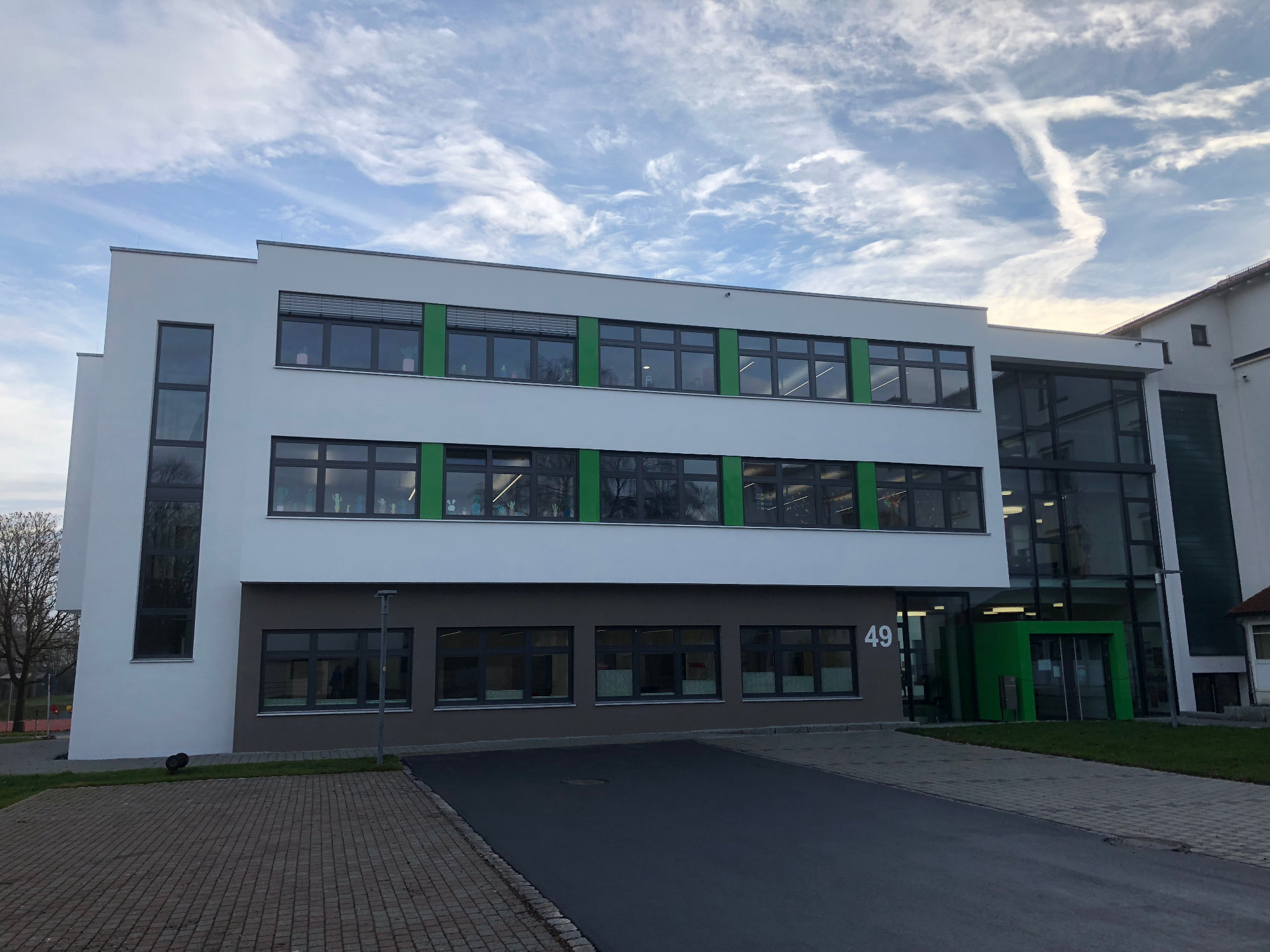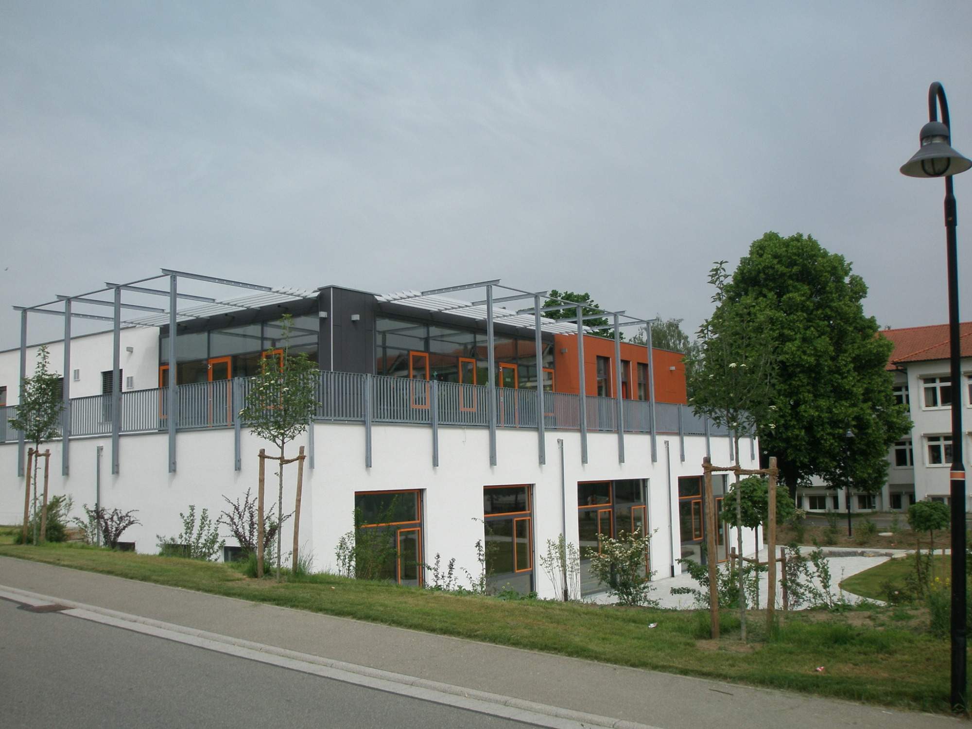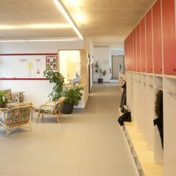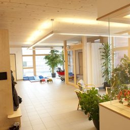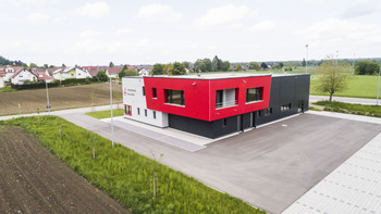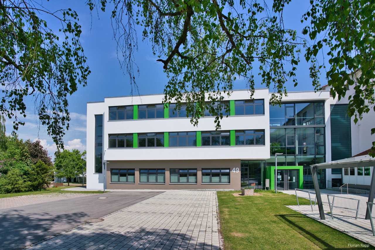 Moderne Gebäude mit großer Fensterfront, orangefarbenem Akzent und Grünflächen davor.