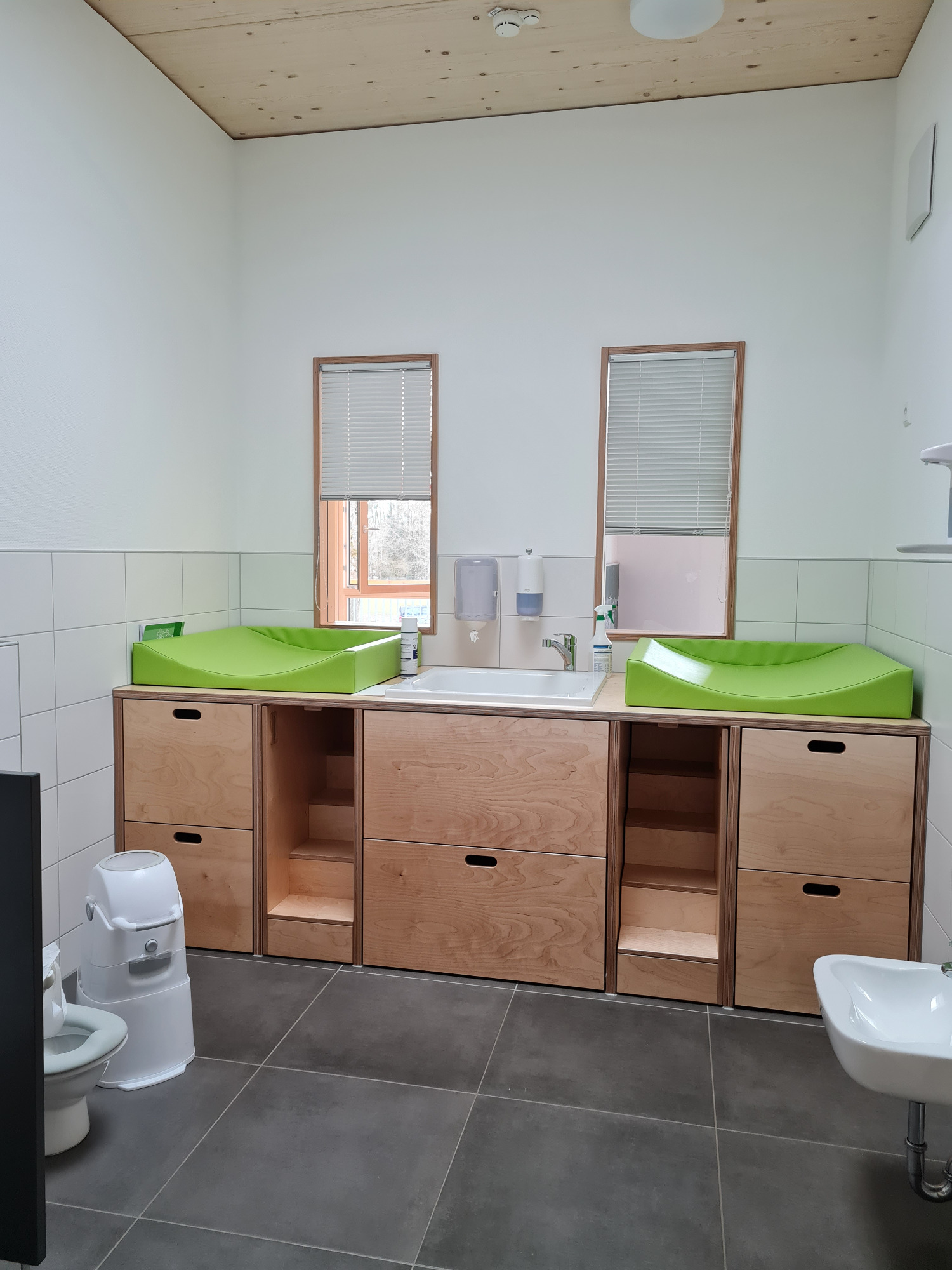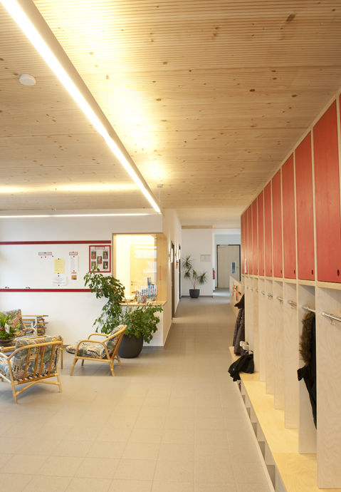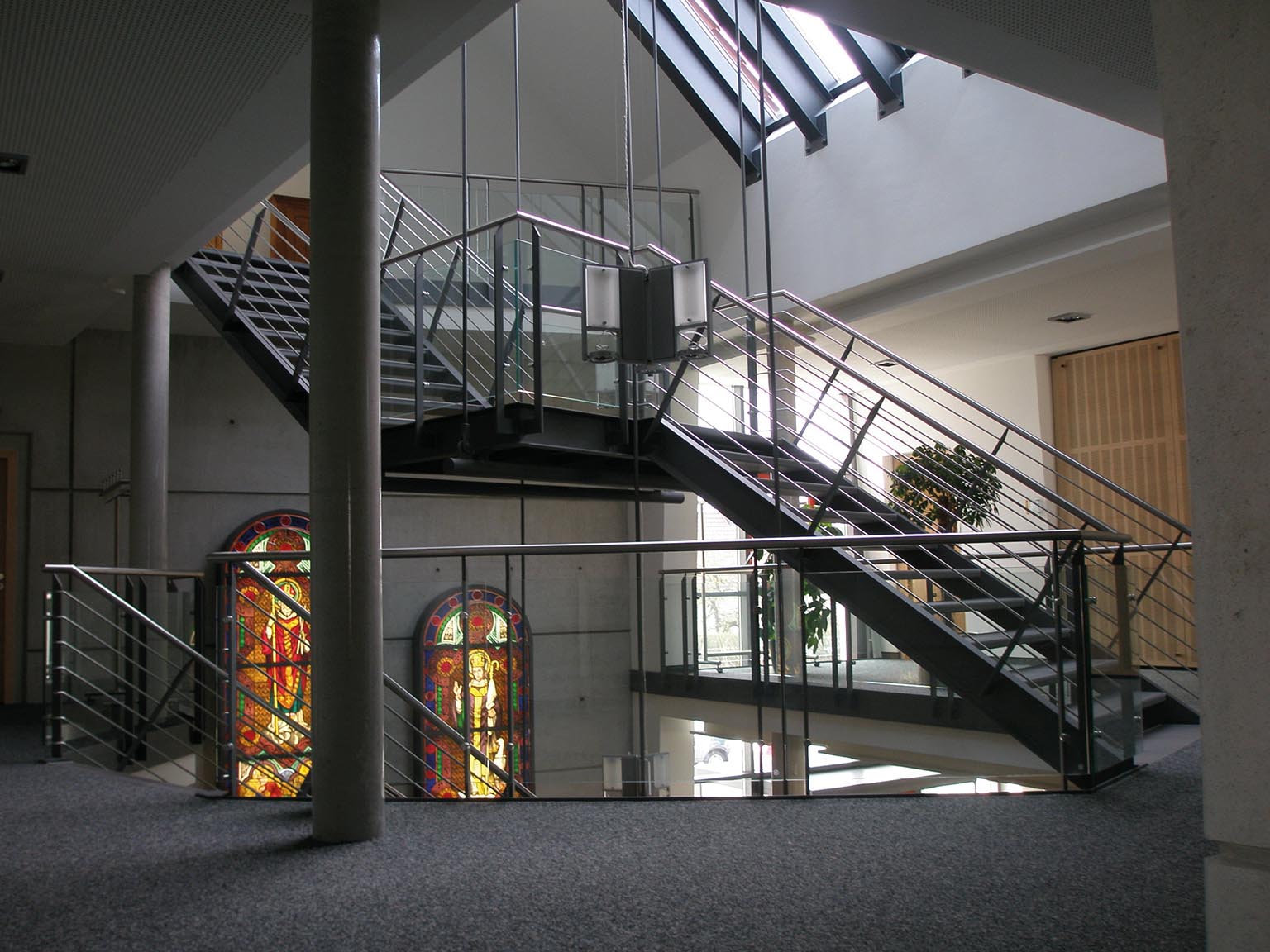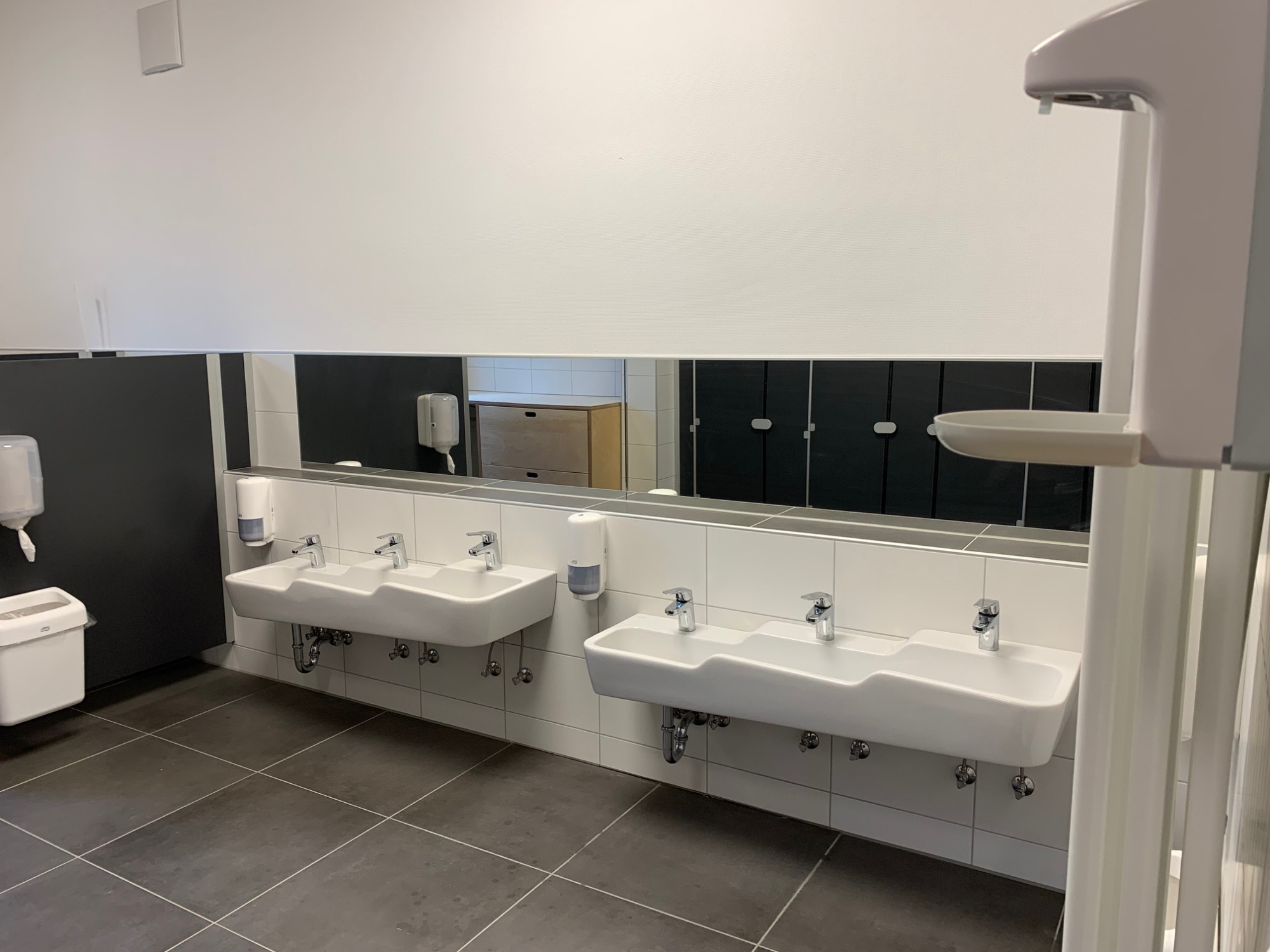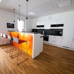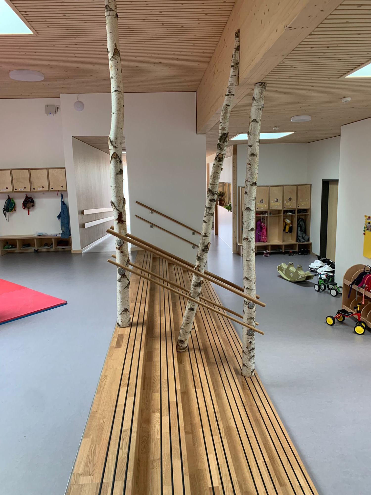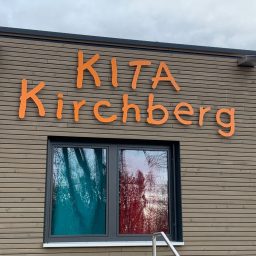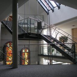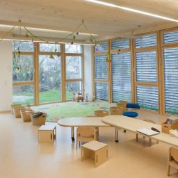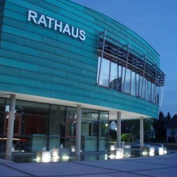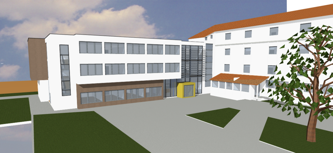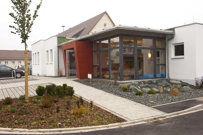 Moderne Gebäude mit großer Fensterfront, orangefarbenem Akzent und Grünflächen davor.