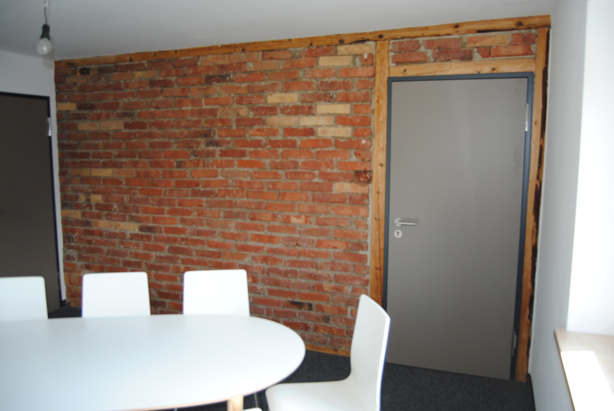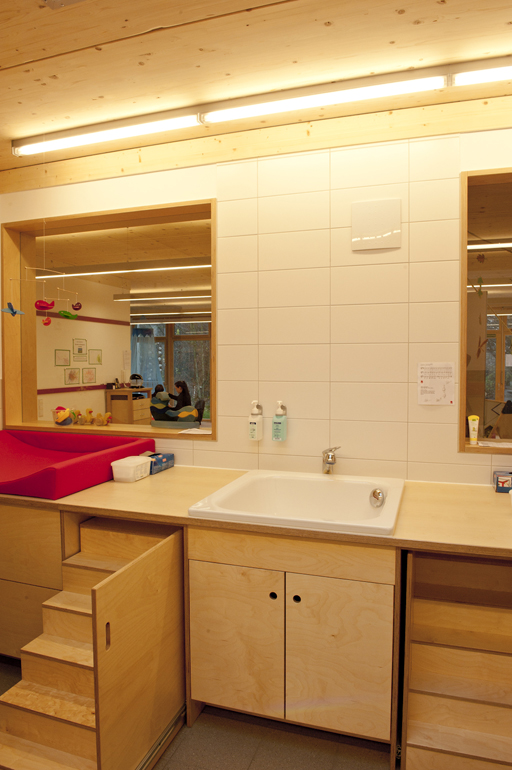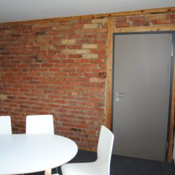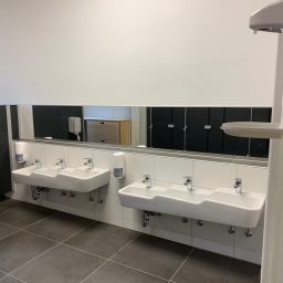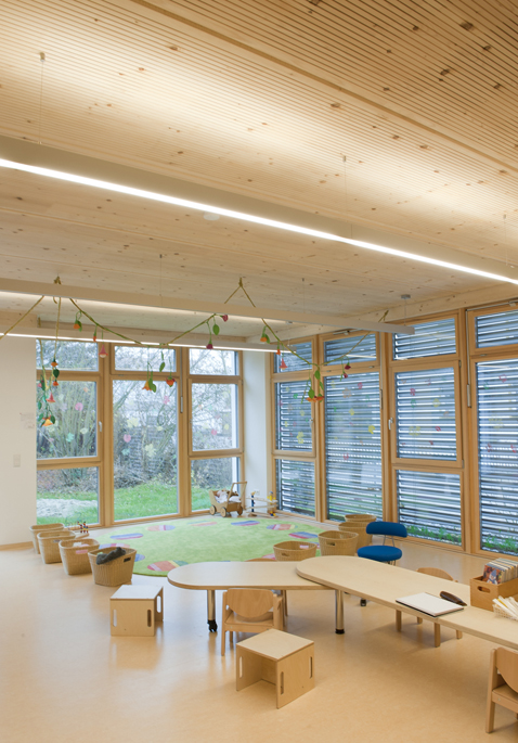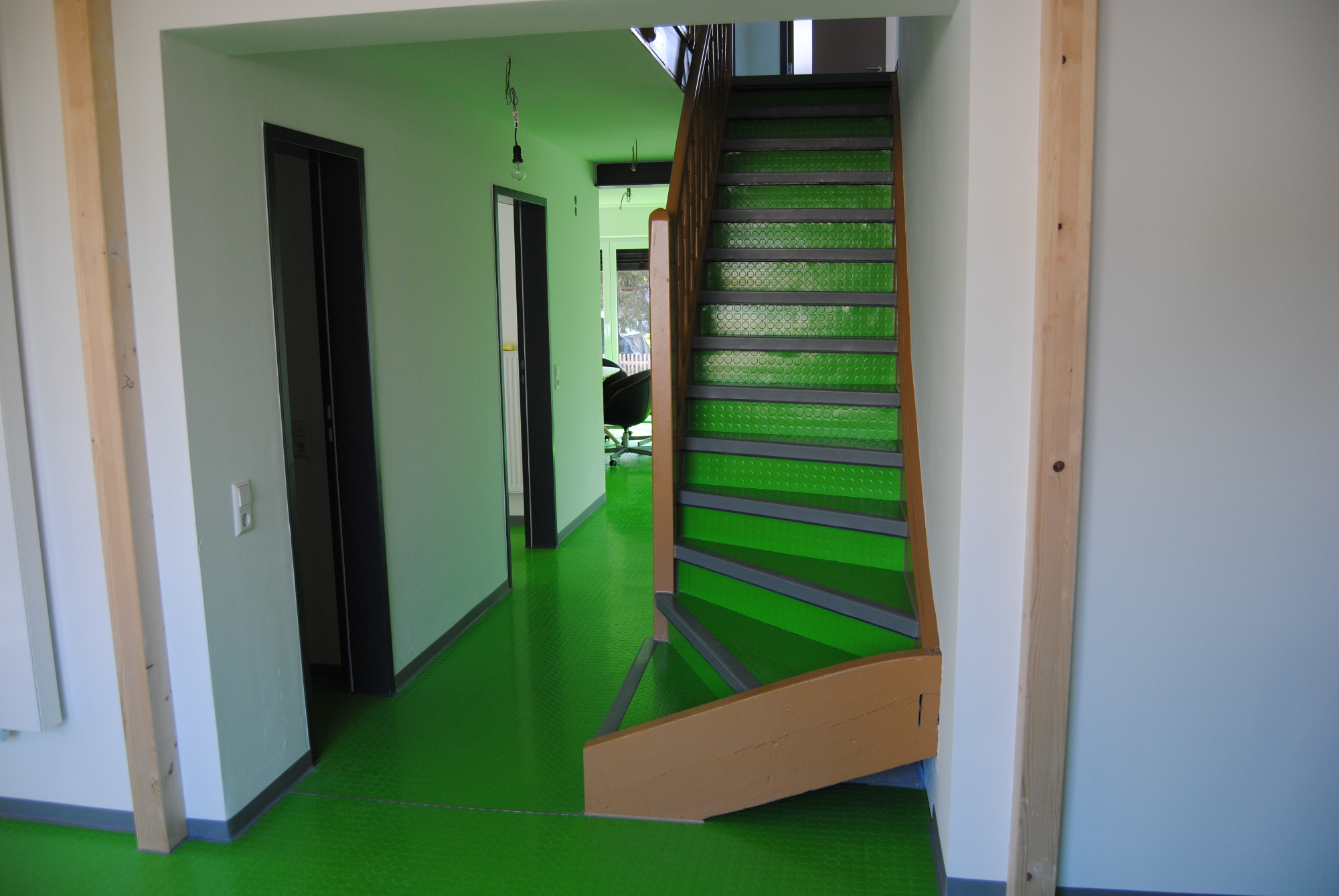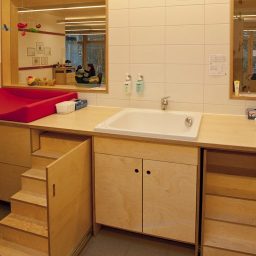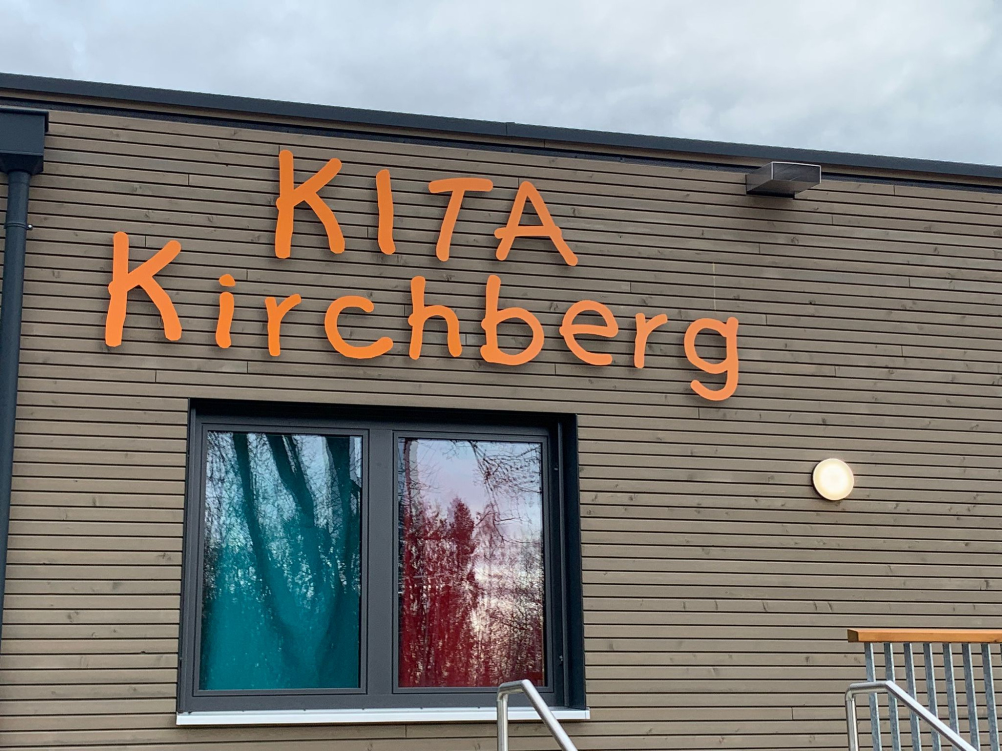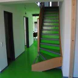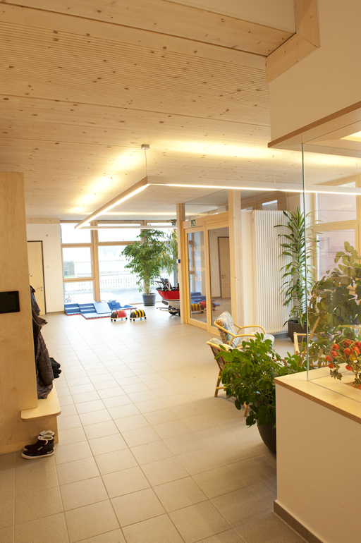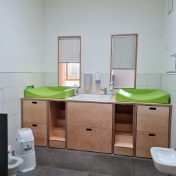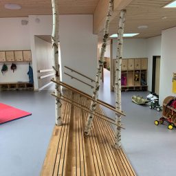 Moderne Gebäude mit großer Fensterfront, orangefarbenem Akzent und Grünflächen davor.