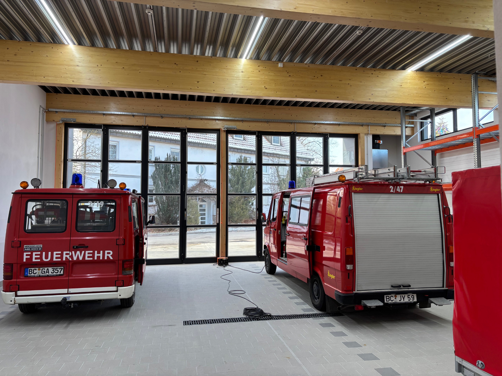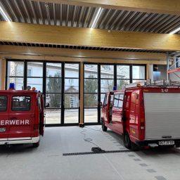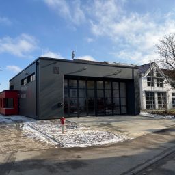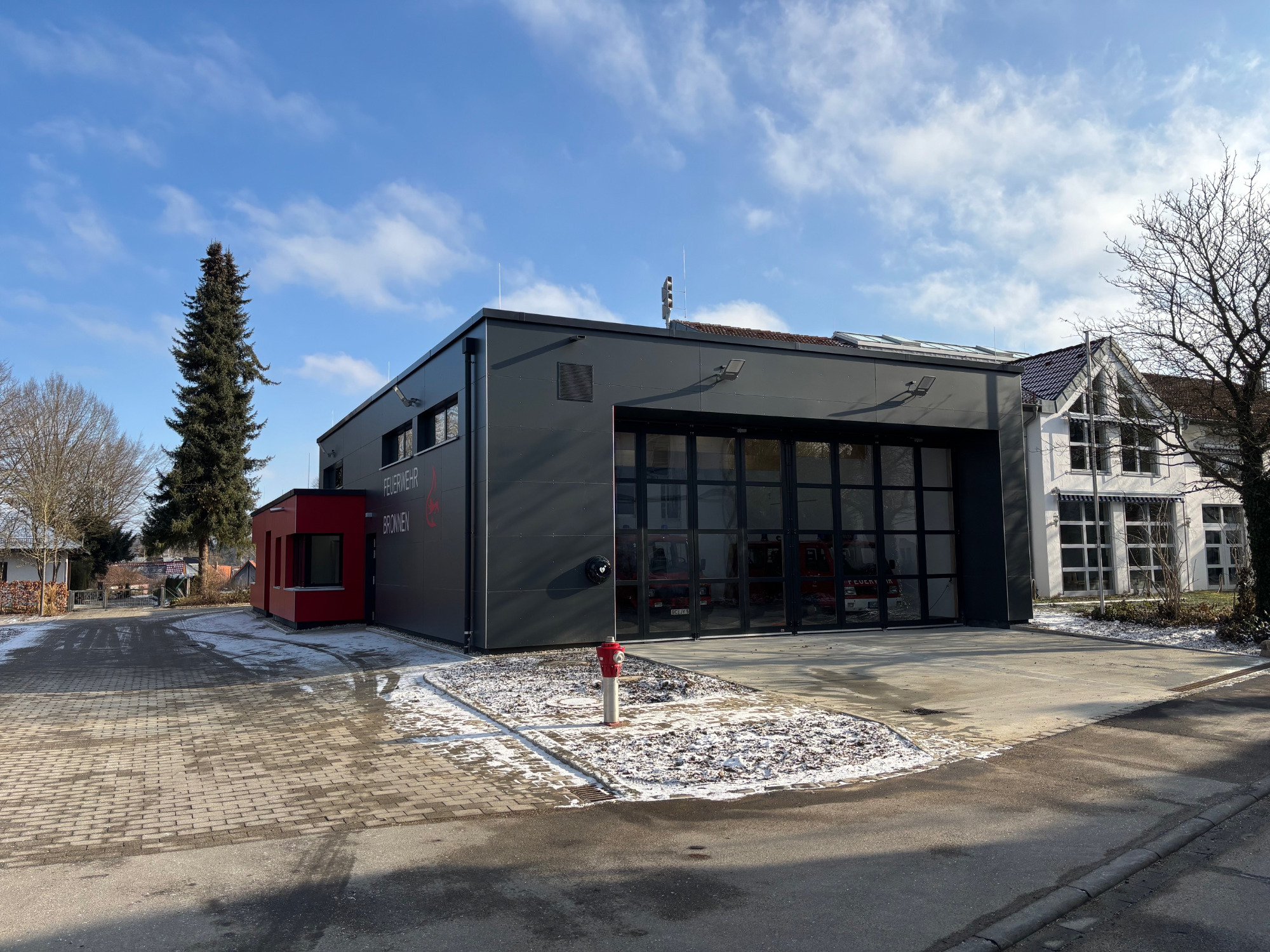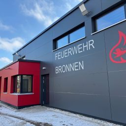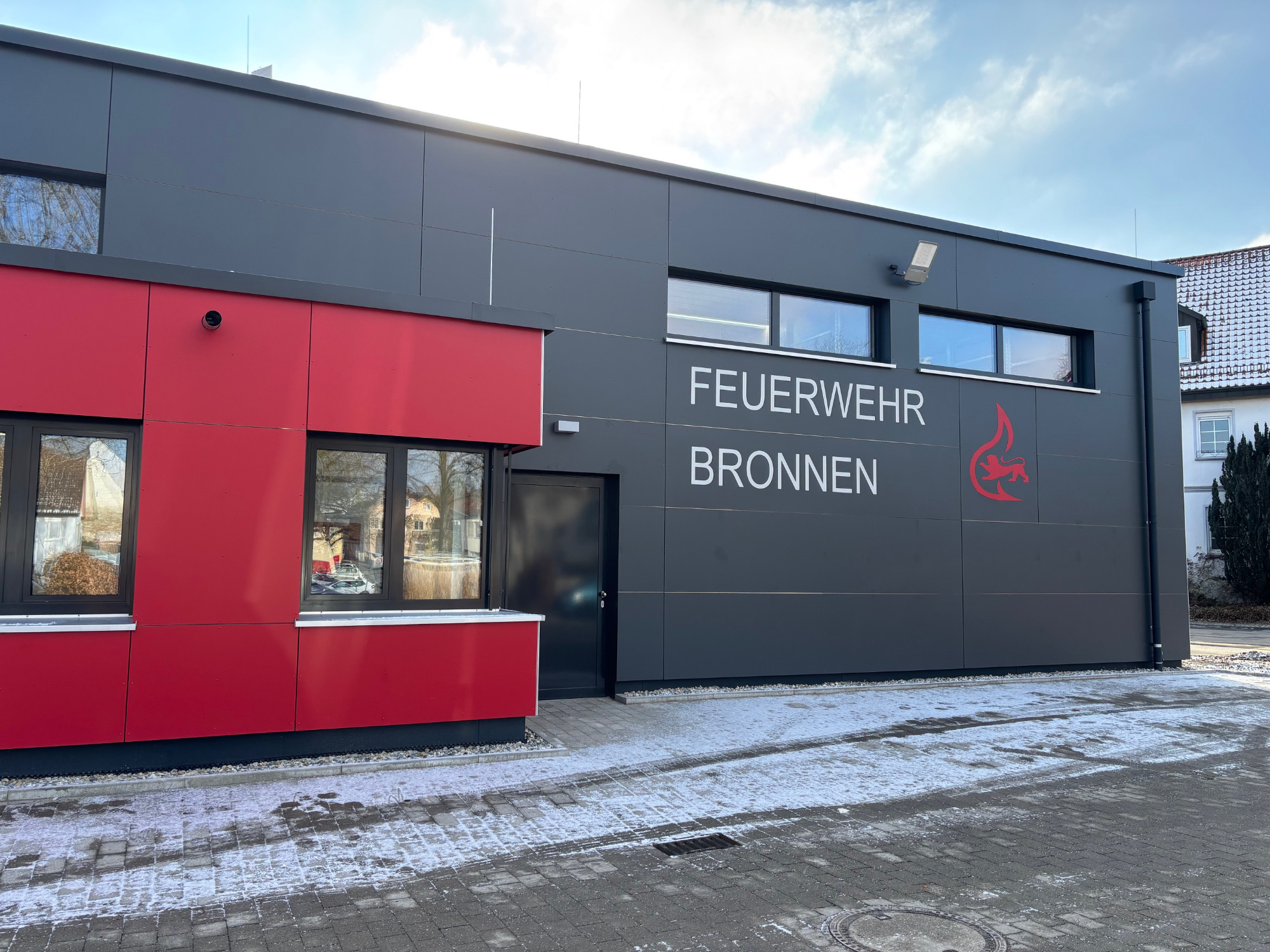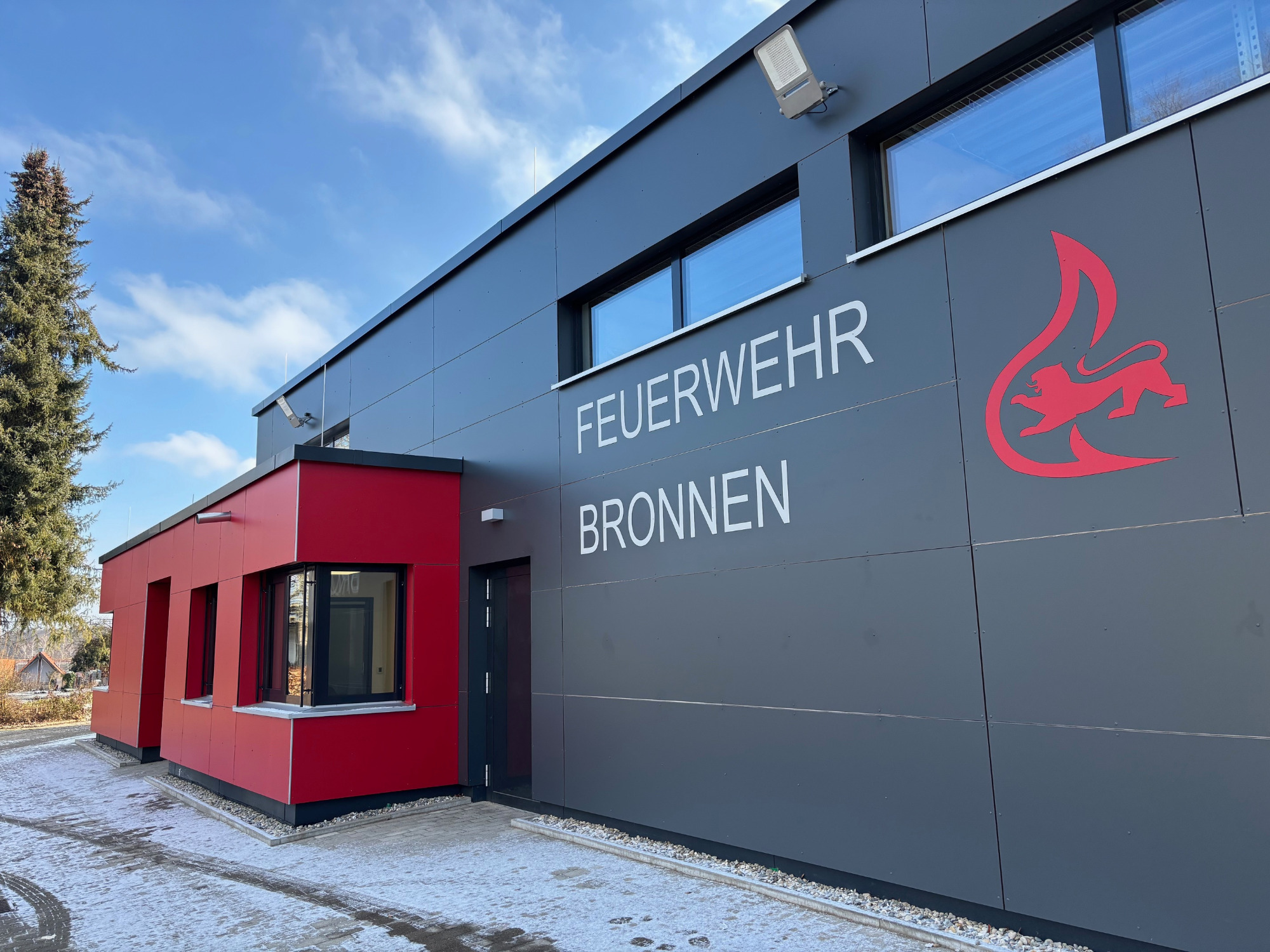 Fassade eines modernen Gebäudes mit dem Schriftzug "Feuerwehr Bronnen".