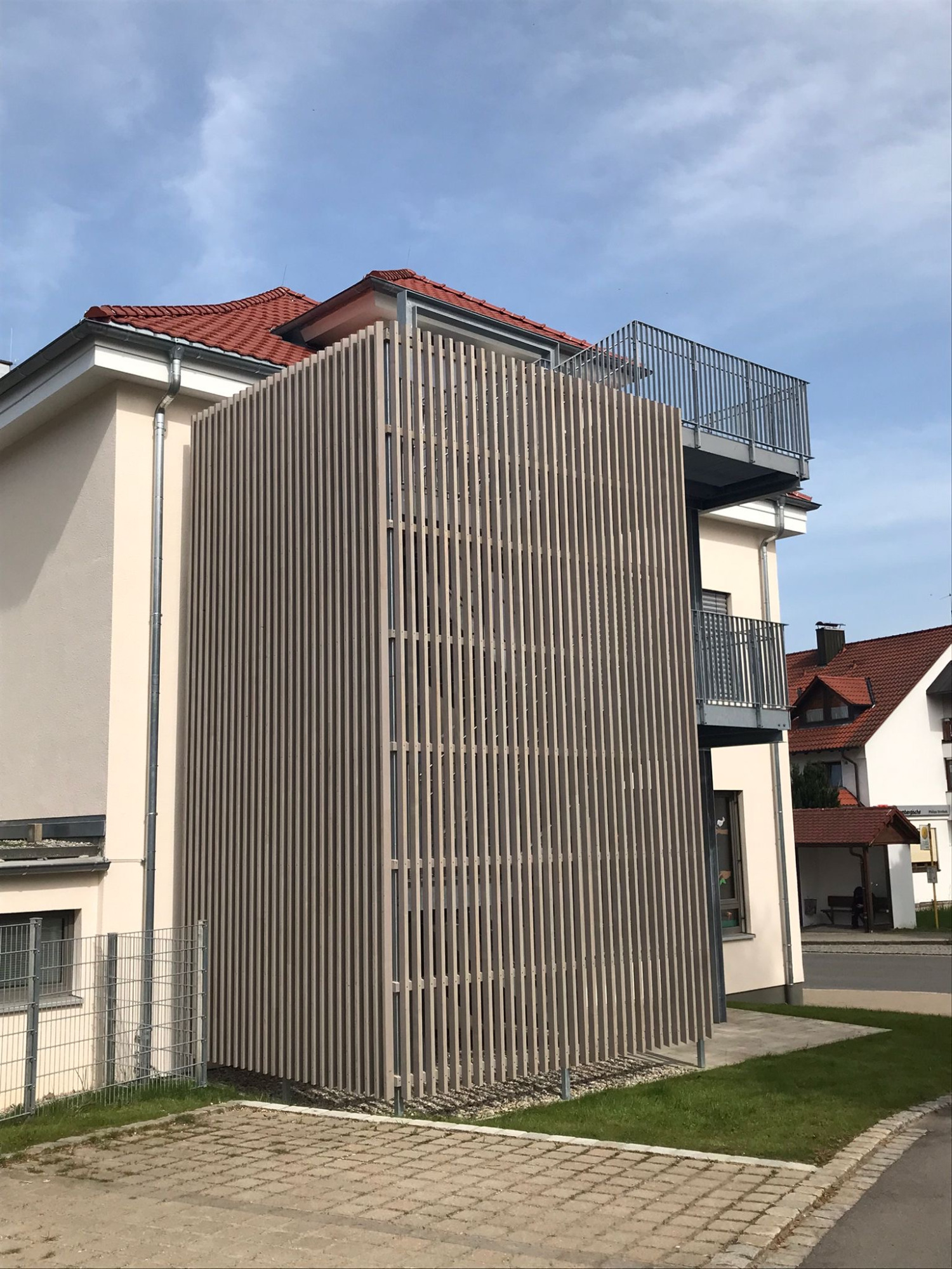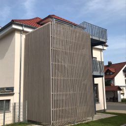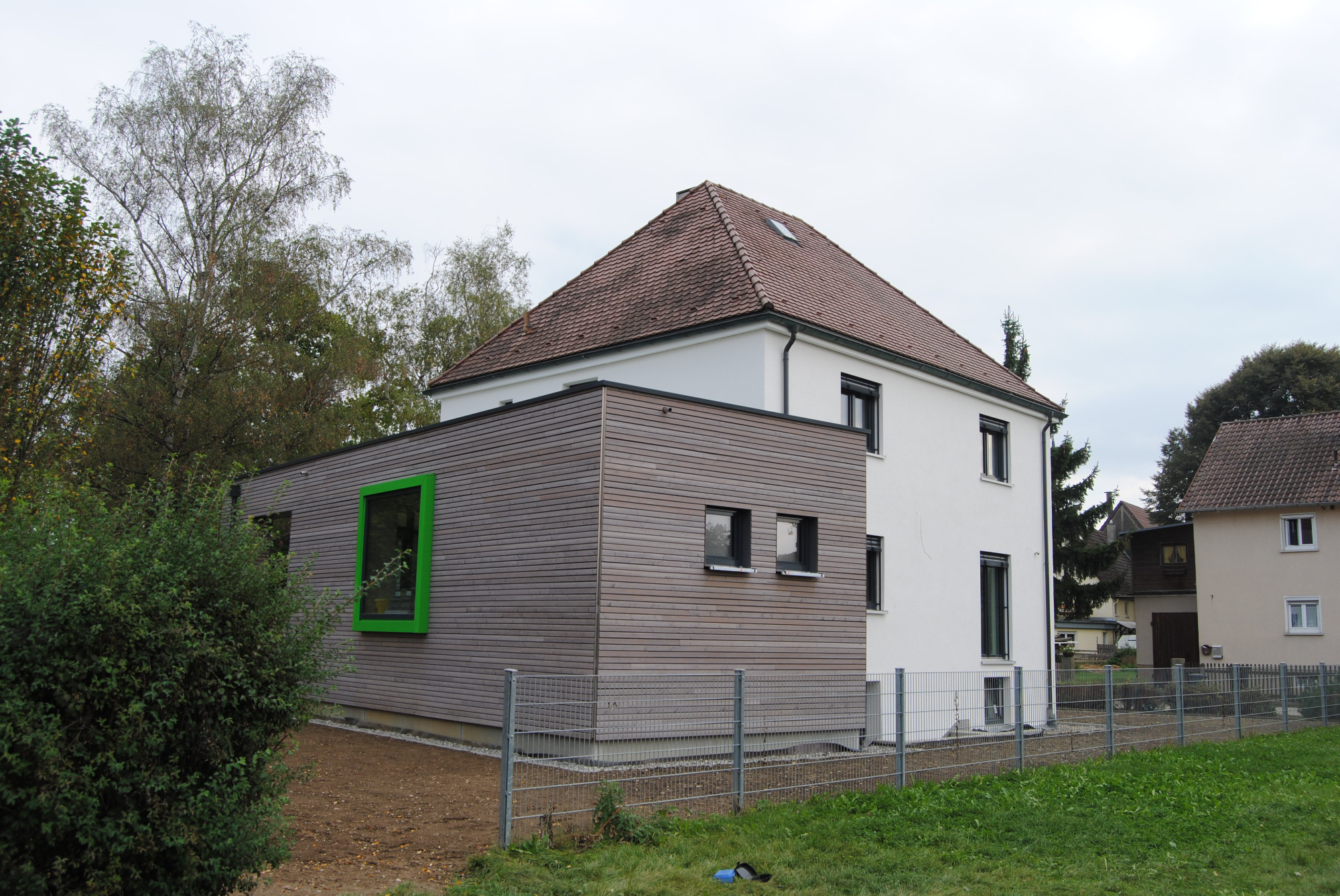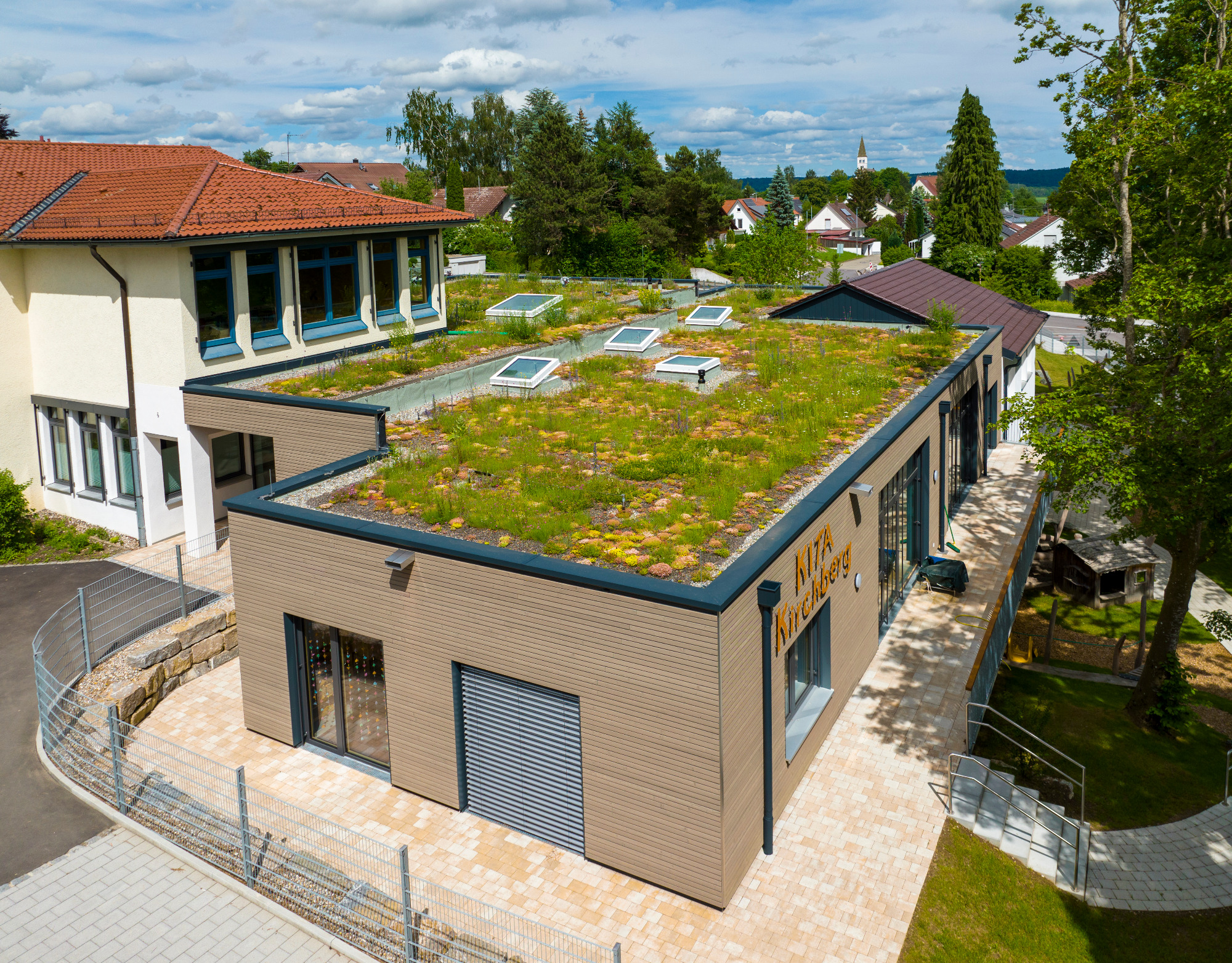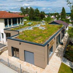 Moderne Architektur mit begrüntem Außenbereich und mehreren Erkern.