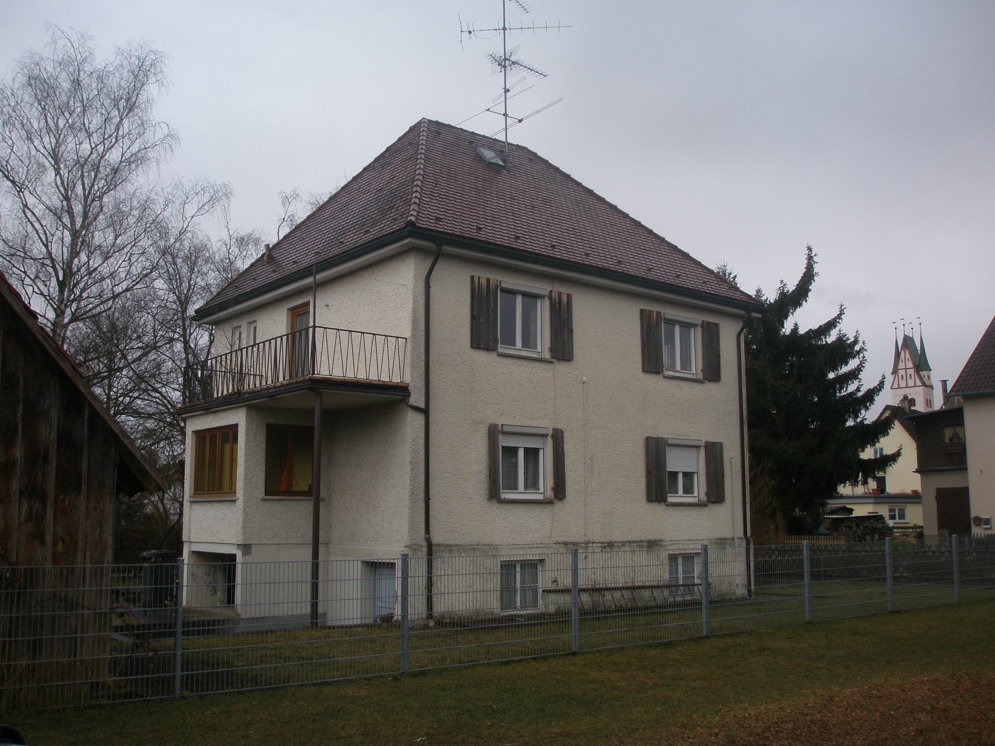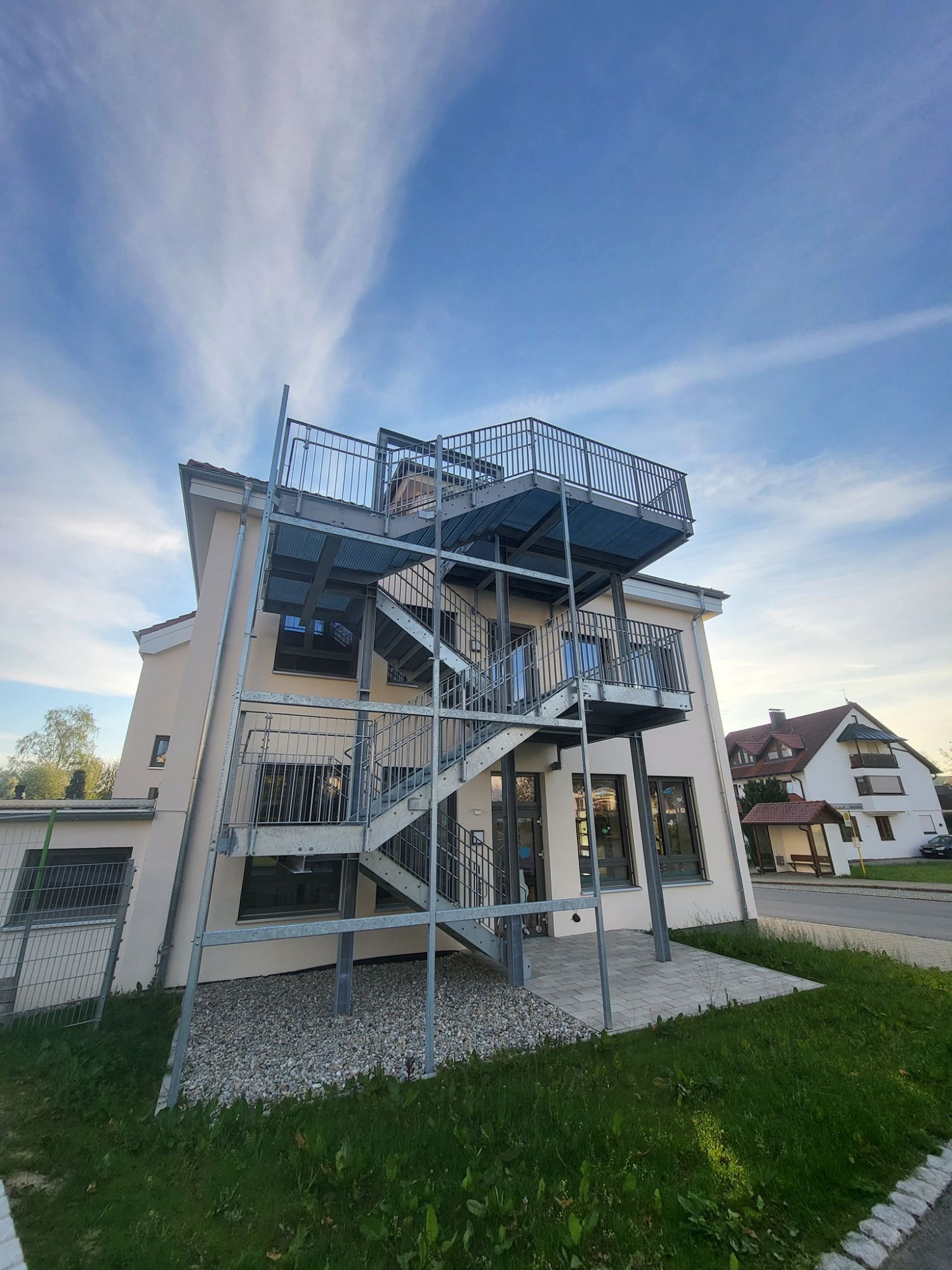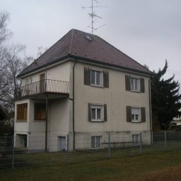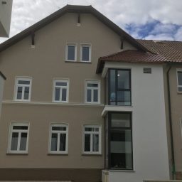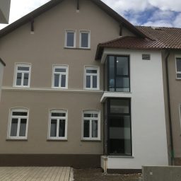 Moderne Architektur mit begrüntem Außenbereich und mehreren Erkern.
