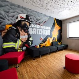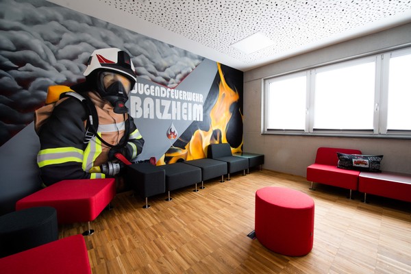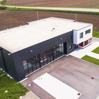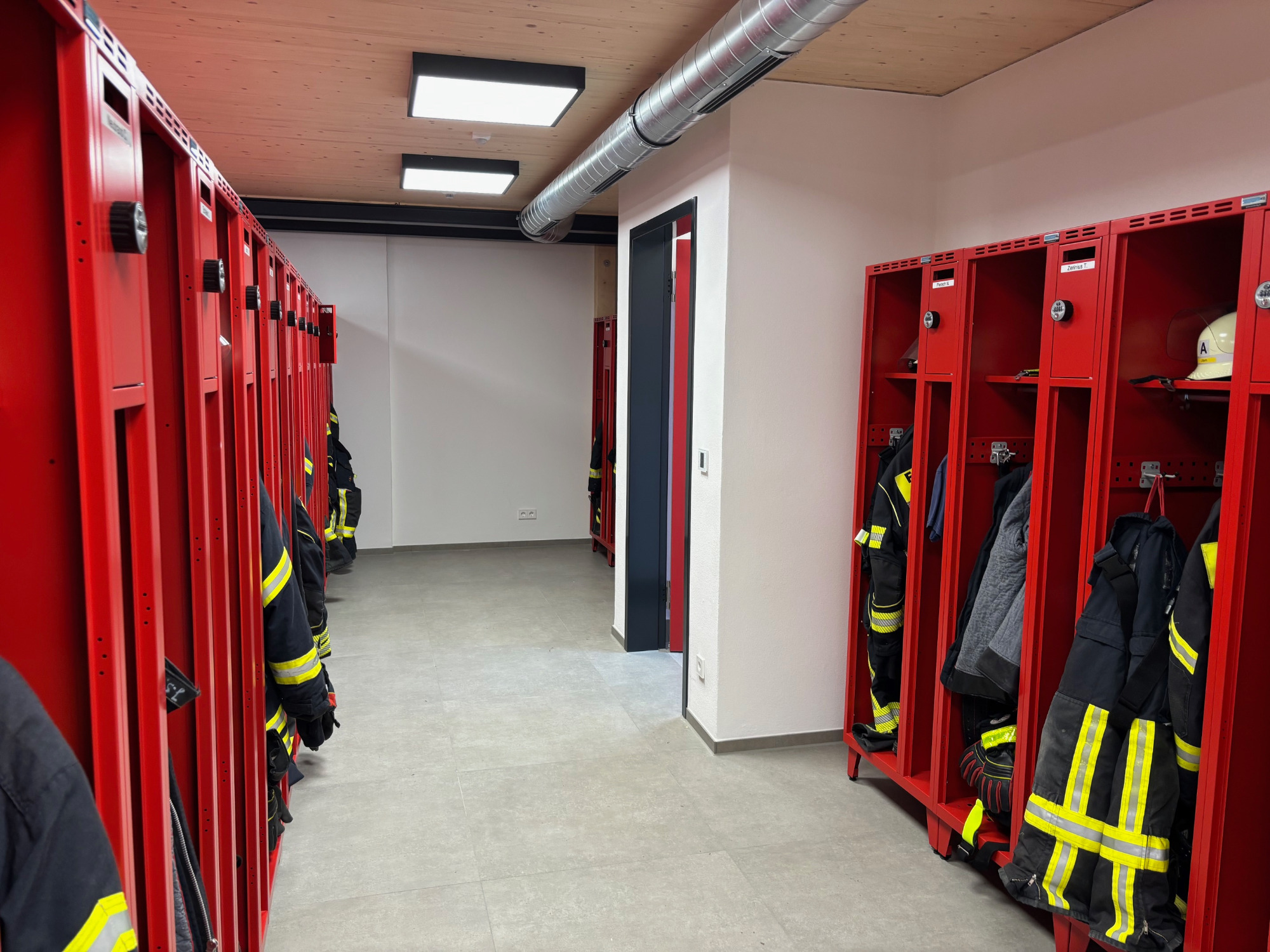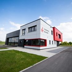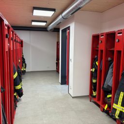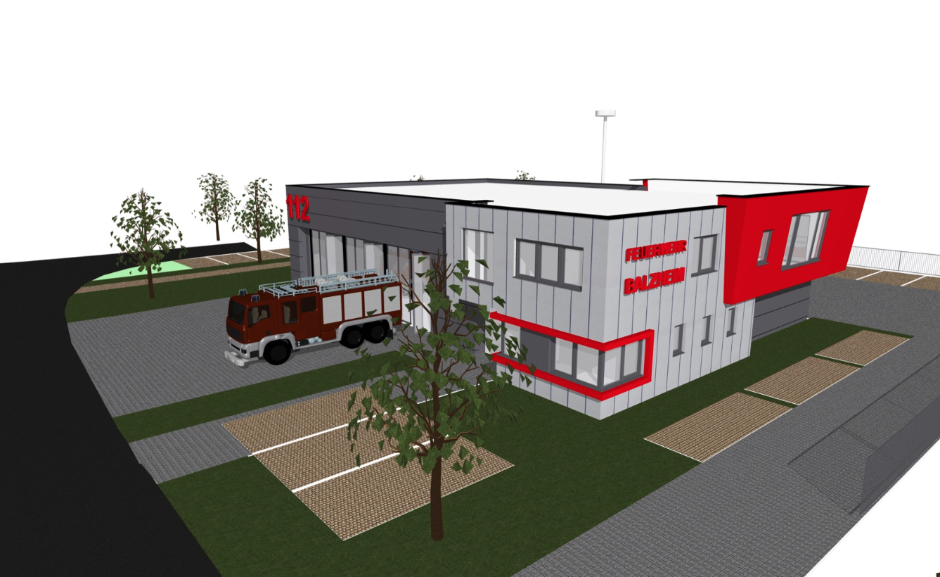 Moderne Feuerwache mit rotem Akzent und Feuerwehrfahrzeug im Vordergrund.