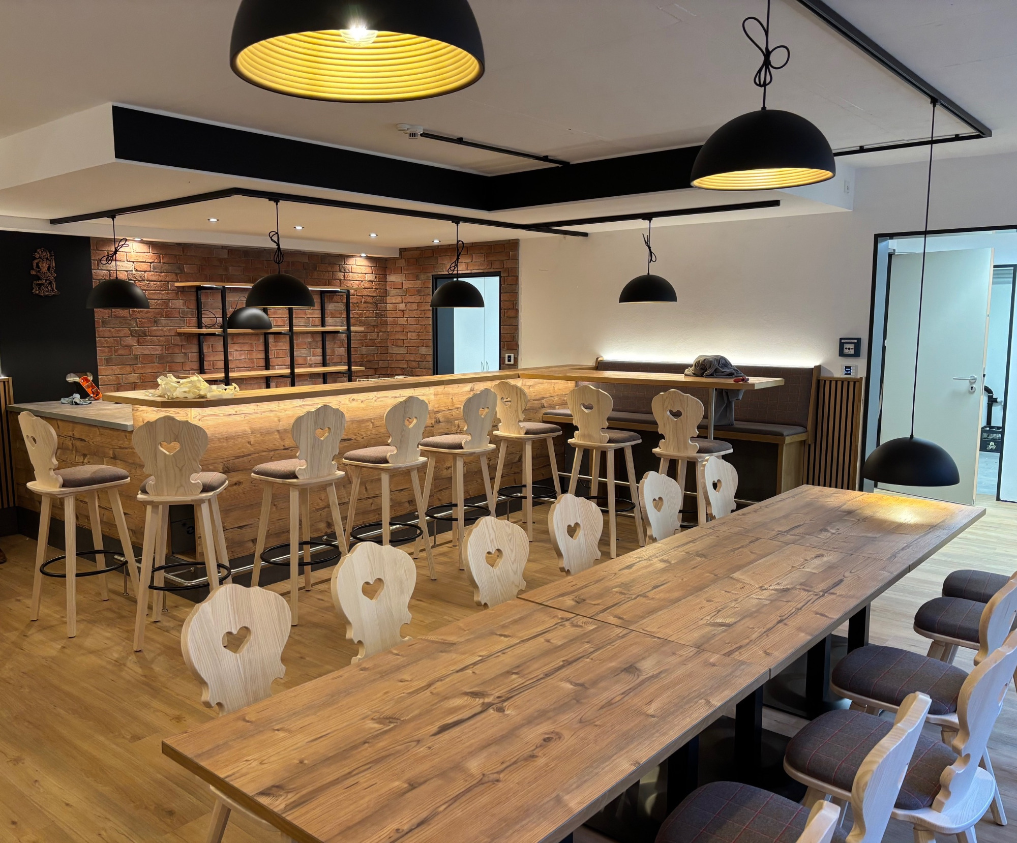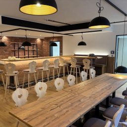 Moderne Gebäude mit Glasfront und orangefarbenem Dach in einer offenen Landschaft.
