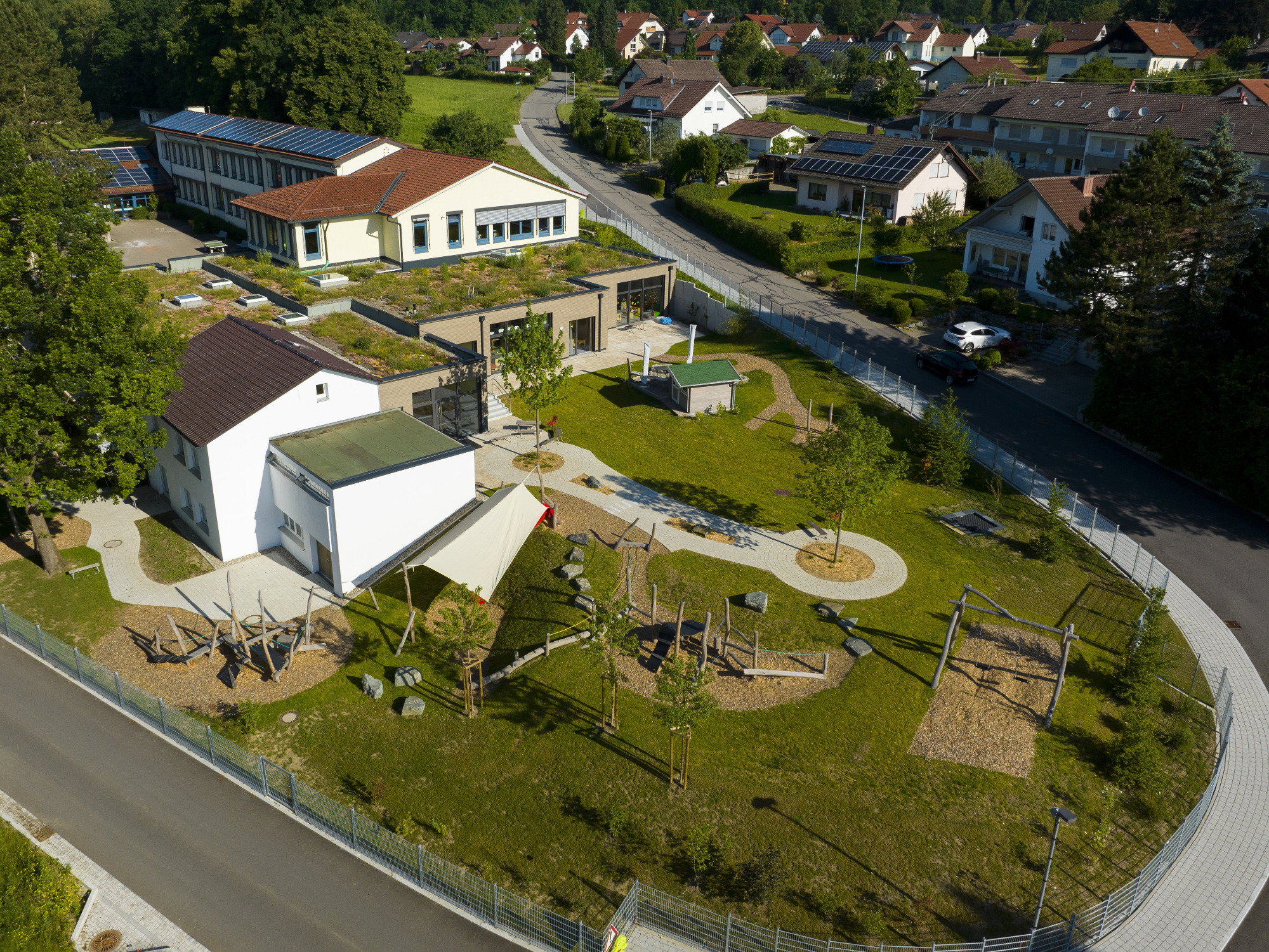 Luftaufnahme eines Spielplatzes mit Rutschen, Schaukeln und umliegenden Gebäuden.