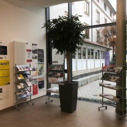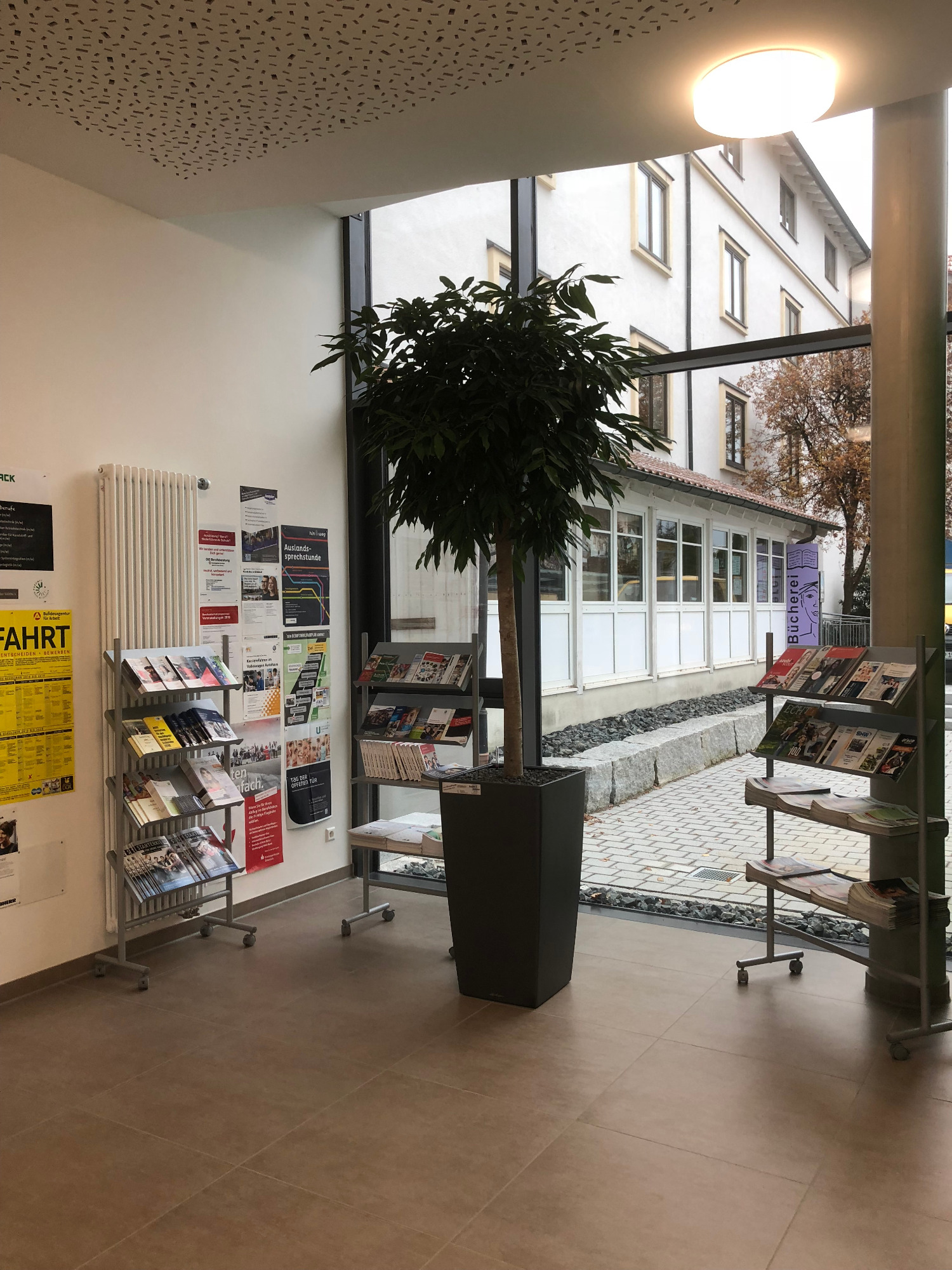 Historisches Gebäude mit vielen Fenstern und grüner Bepflanzung im Vordergrund.