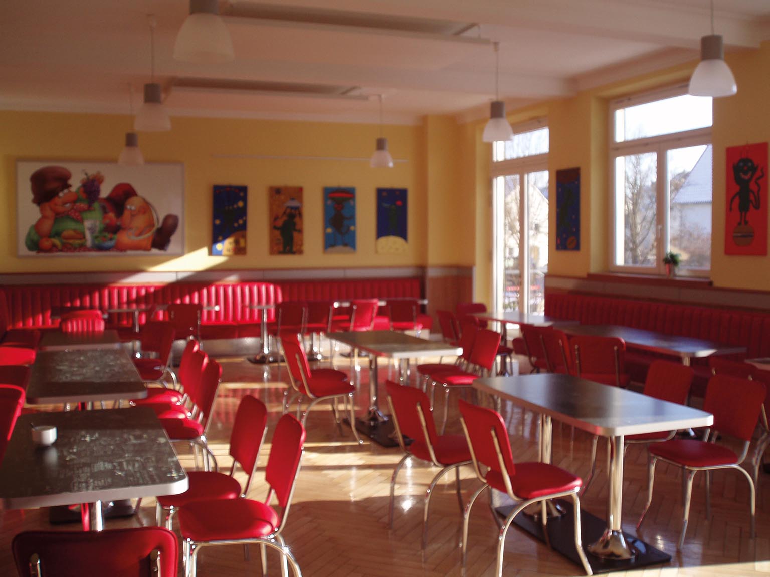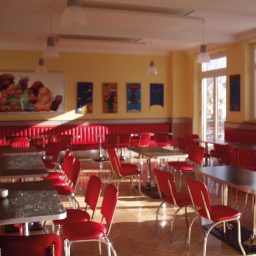Helle Café-Umgebung mit roten Stühlen und großen Fenstern.